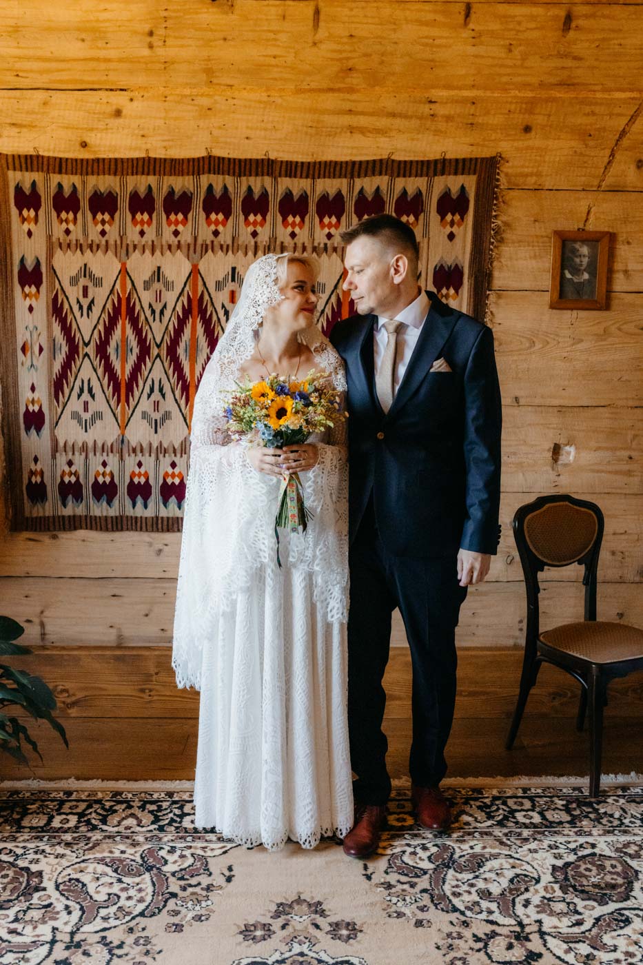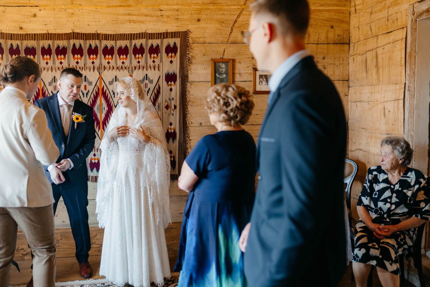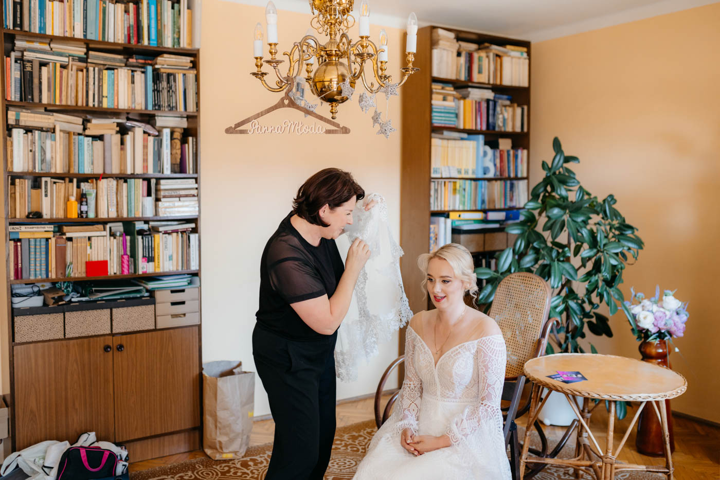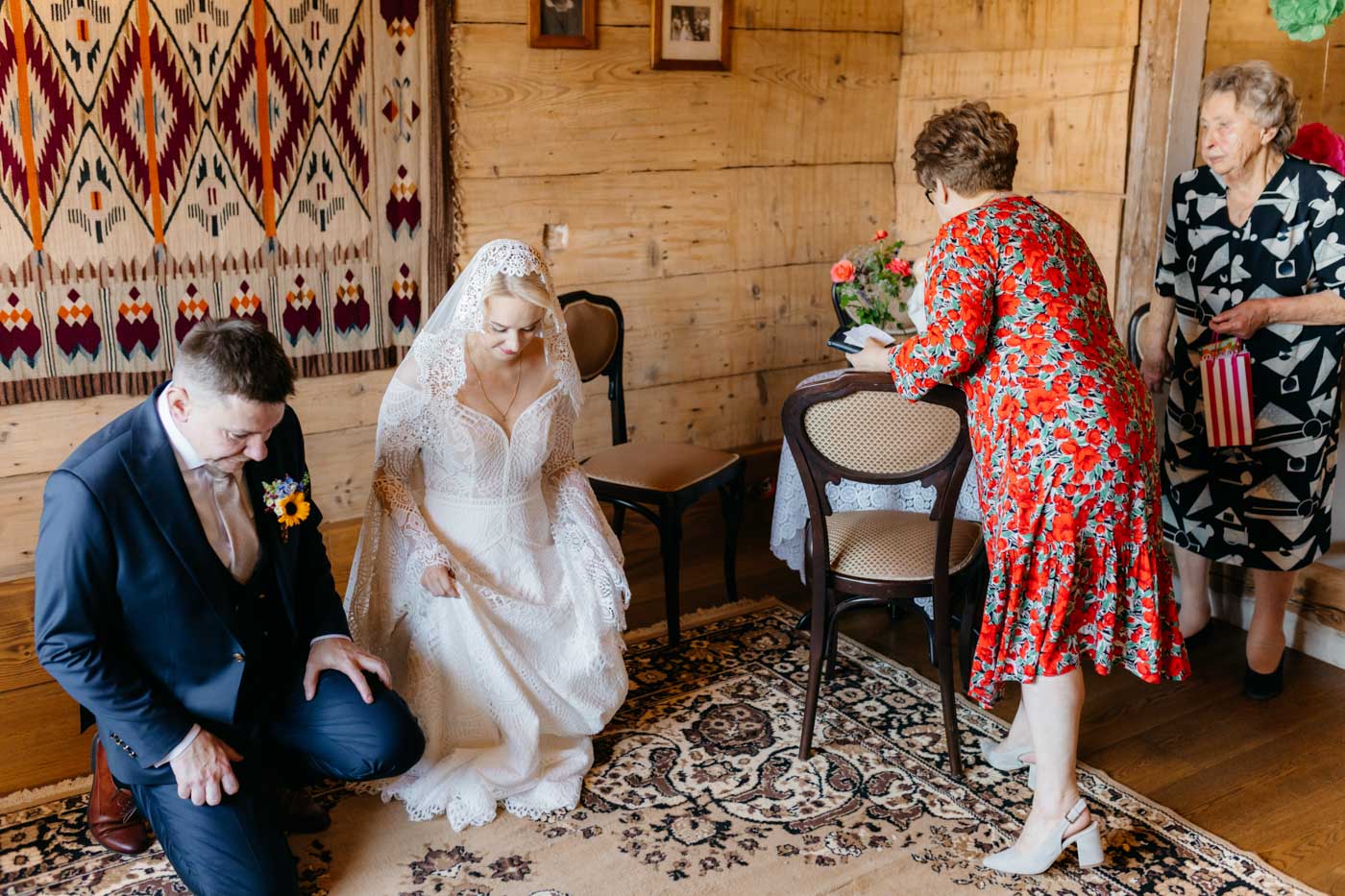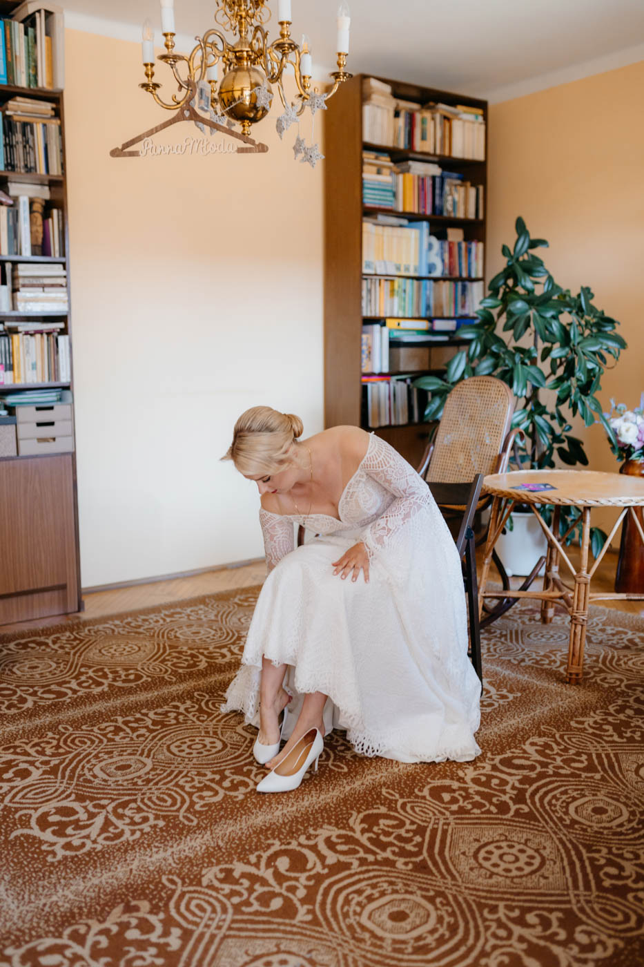 Regały uginające się pod ciężarem klasyki literatury, stare wydania Wyspiańskiego i obleczony koronką welon. W momencie w którym przekroczyłam próg domu Ewy i zobaczyłam te wszystkie detale zrozumiałam, że to będzie na prawdę inne wesele. Pełne nawiązań do tradycji i folkloru. Co rusz na każdym kroku zaskakiwały mnie i wzruszały elementy związane z historią rodziny Panny Młodej. Niezwykły stary dom, dywany na ścianach jak za dawnych lat, polne kwiaty – to wszystko stworzyło przepiękne tło do tego, co miało się wydarzyć tego dnia.