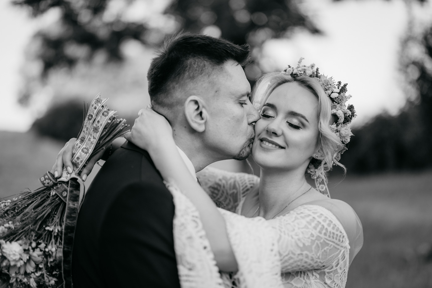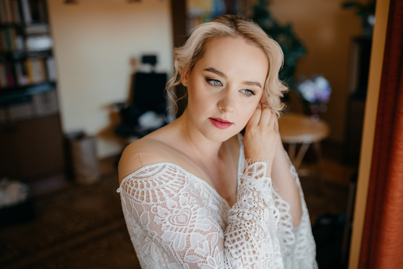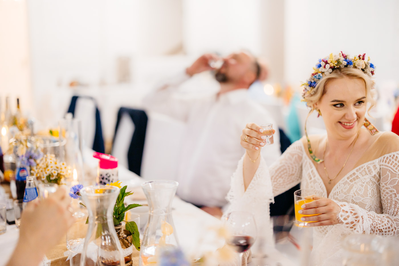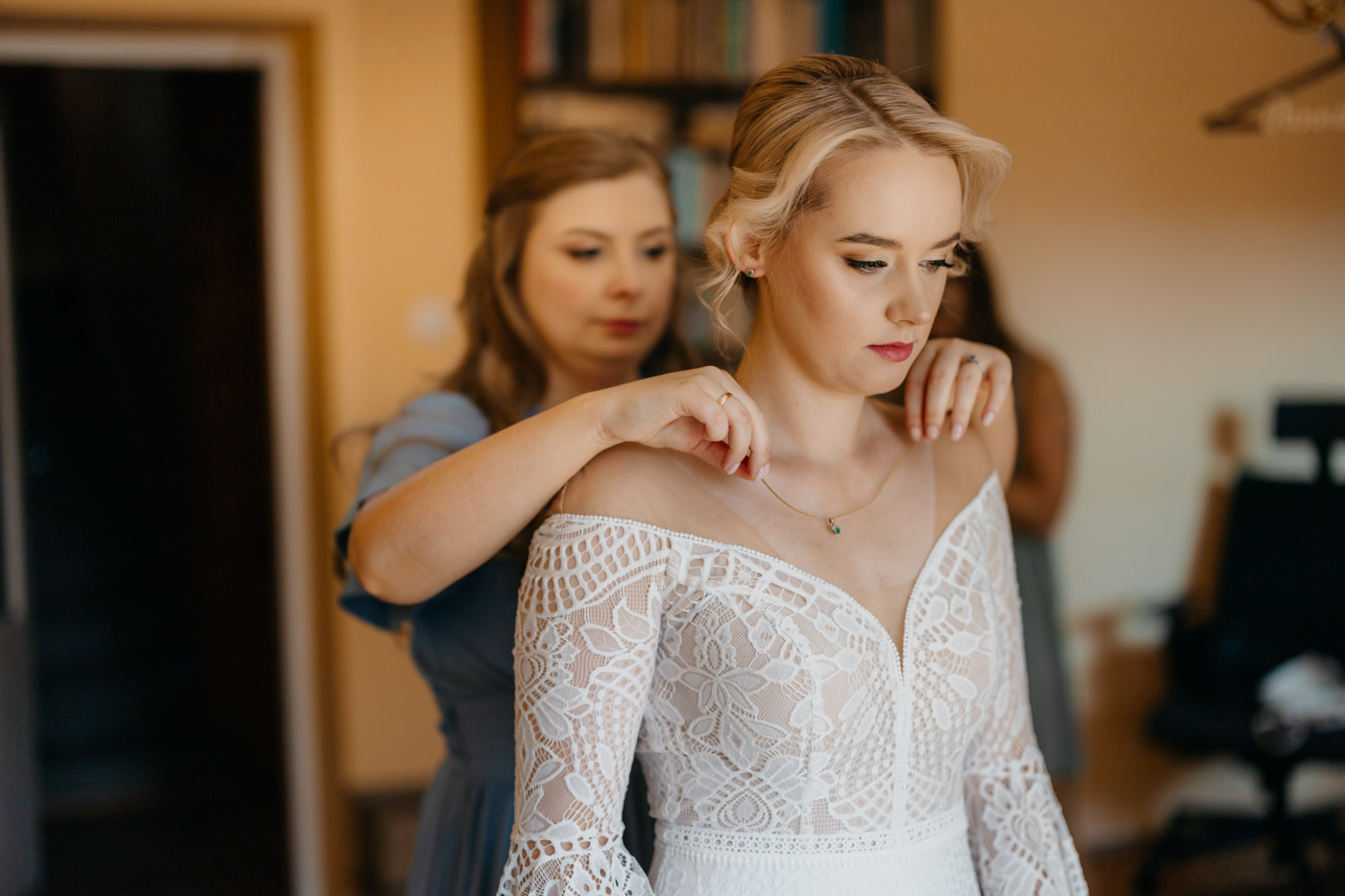 Regały uginające się pod ciężarem klasyki literatury, stare wydania Wyspiańskiego i obleczony koronką welon. W momencie w którym przekroczyłam próg domu Ewy i zobaczyłam te wszystkie detale zrozumiałam, że to będzie na prawdę inne wesele. Pełne nawiązań do tradycji i folkloru. Co rusz na każdym kroku zaskakiwały mnie i wzruszały elementy związane z historią rodziny Panny Młodej. Niezwykły stary dom, dywany na ścianach jak za dawnych lat, polne kwiaty – to wszystko stworzyło przepiękne tło do tego, co miało się wydarzyć tego dnia.