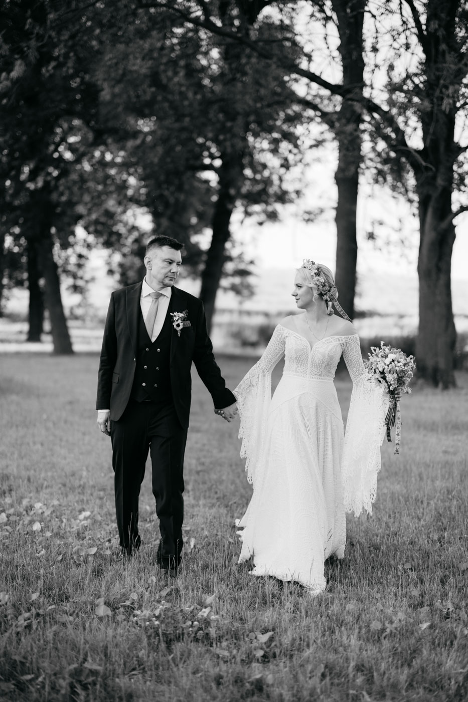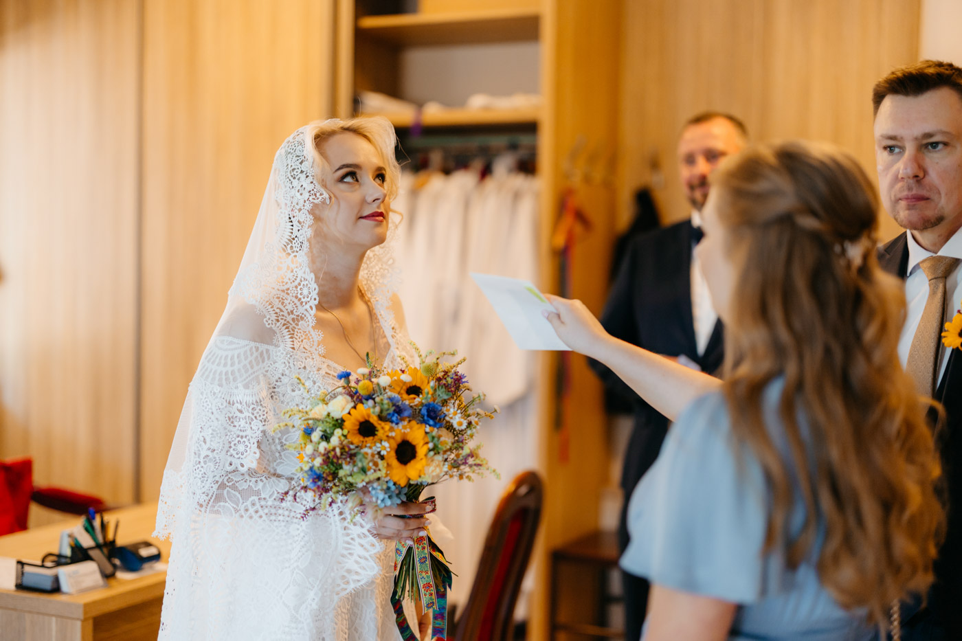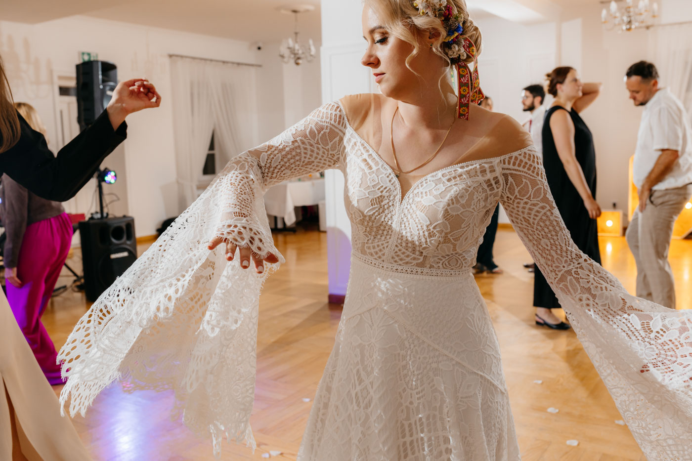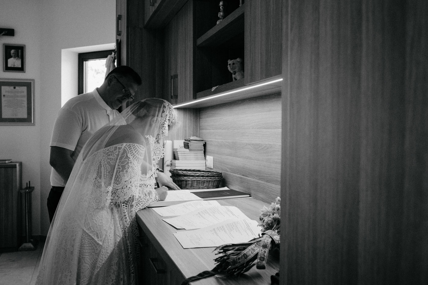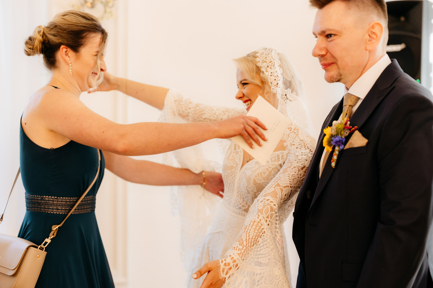 Regały uginające się pod ciężarem klasyki literatury, stare wydania Wyspiańskiego i obleczony koronką welon. W momencie w którym przekroczyłam próg domu Ewy i zobaczyłam te wszystkie detale zrozumiałam, że to będzie na prawdę inne wesele. Pełne nawiązań do tradycji i folkloru. Co rusz na każdym kroku zaskakiwały mnie i wzruszały elementy związane z historią rodziny Panny Młodej. Niezwykły stary dom, dywany na ścianach jak za dawnych lat, polne kwiaty – to wszystko stworzyło przepiękne tło do tego, co miało się wydarzyć tego dnia.