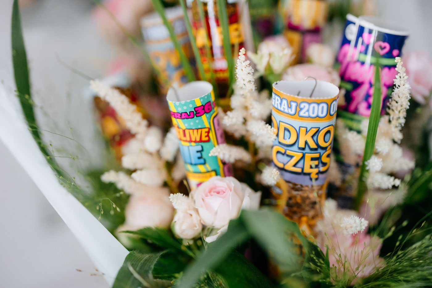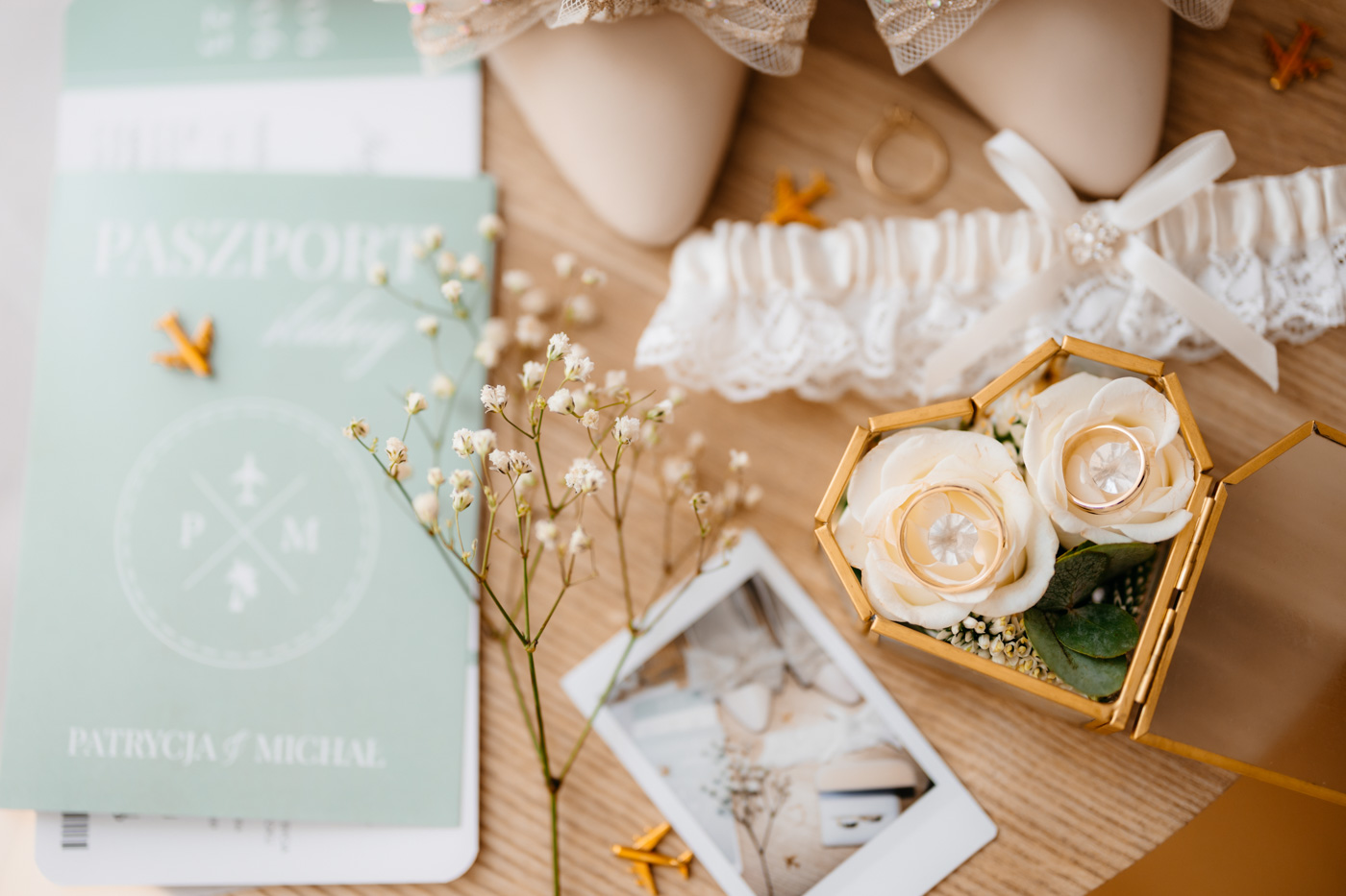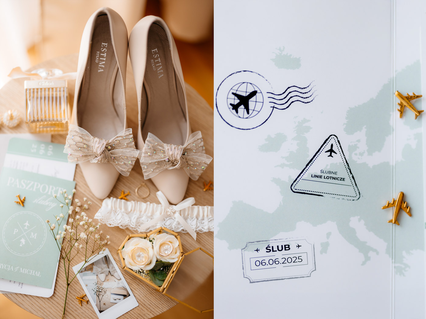 Już zaproszenia ślubne przyciągały uwagę – zostały zaprojektowane na wzór biletów lotniczych, zapowiadając gościom, że ten dzień będzie prawdziwą podróżą. Motyw samolotu i walizek przewijał się przez cały dzień: od przygotowań aż po salę weselną, gdzie kompozycje kwiatowe umieszczono w stylizowanych walizkach, a każdy gość otrzymał mały upominek w postaci miniaturowej walizki – symbolicznej pamiątki z „podróży” w dzień miłości tej pary.