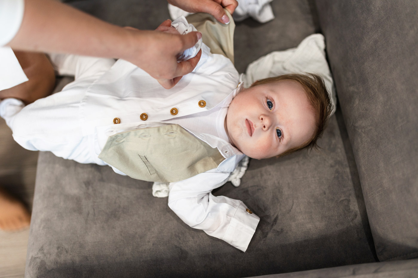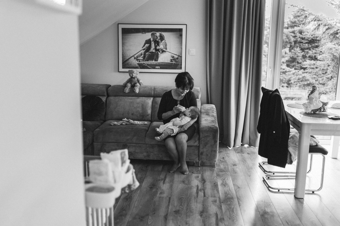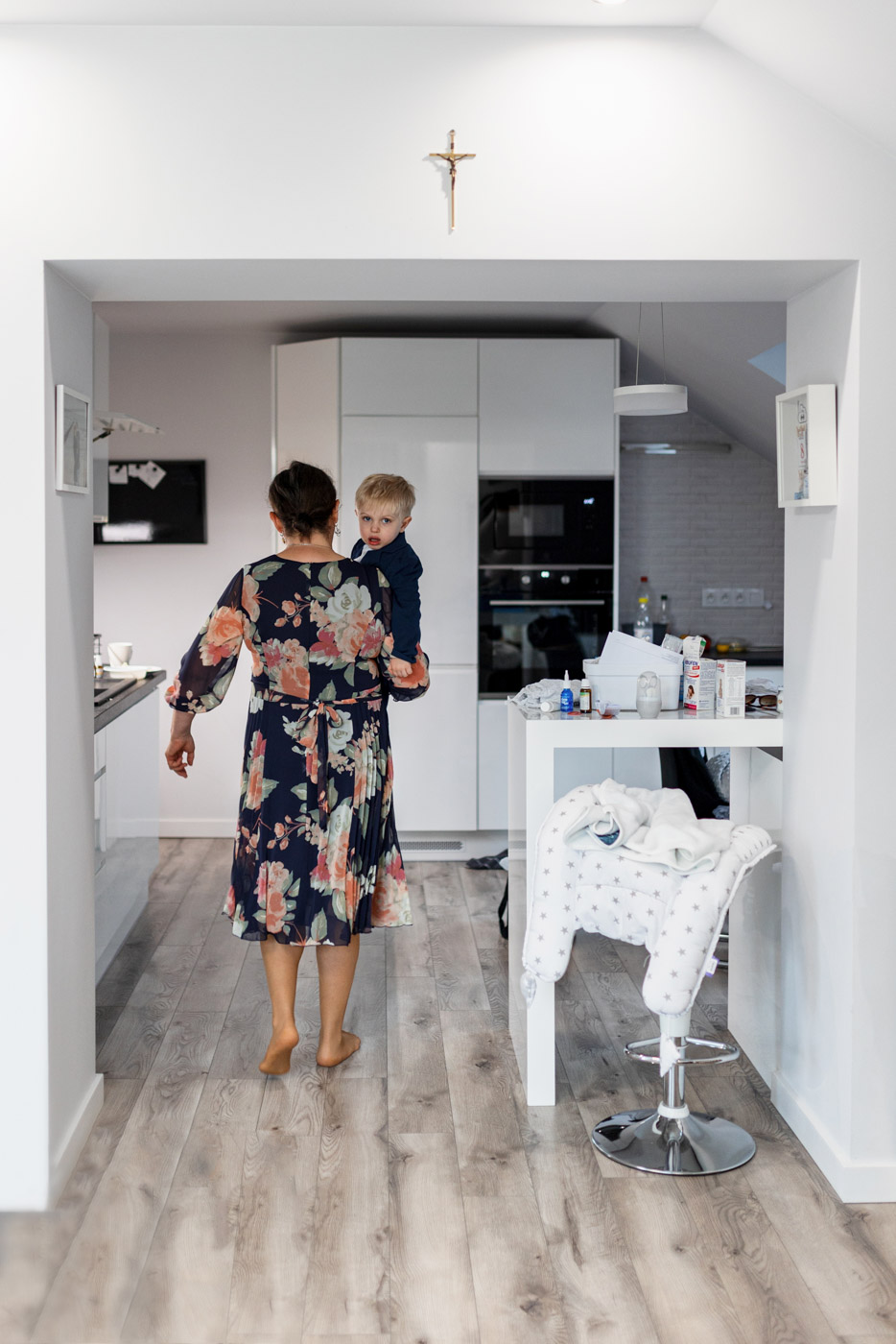 Reportaż Chrztu Świętego w Gdowie rozpoczęłam od przygotowań w domu na godzinę przed wyjściem do kościoła. Dzięki temu miałam wystarczająco dużo czasu, aby uwiecznić kilka ważnych detali, takich jak elementy garderoby maluszka, moment karmienia i ubierania. Często w przygotowaniach uczestniczą bliskie Wam osoby – babcie, rodzice chrzestni. To idealna okazja do tego, aby stworzyć kilka pamiątkowych ujęć w zaciszu Waszego domu. Zawsze staram się oprócz zdjęć pozowanych złapać te momenty, w których wasza uwaga nie jest skierowana w kierunku obiektywu. Właśnie takie ujęcia, na których nie widać obecności fotografa, są najbliższe mojemu sercu.