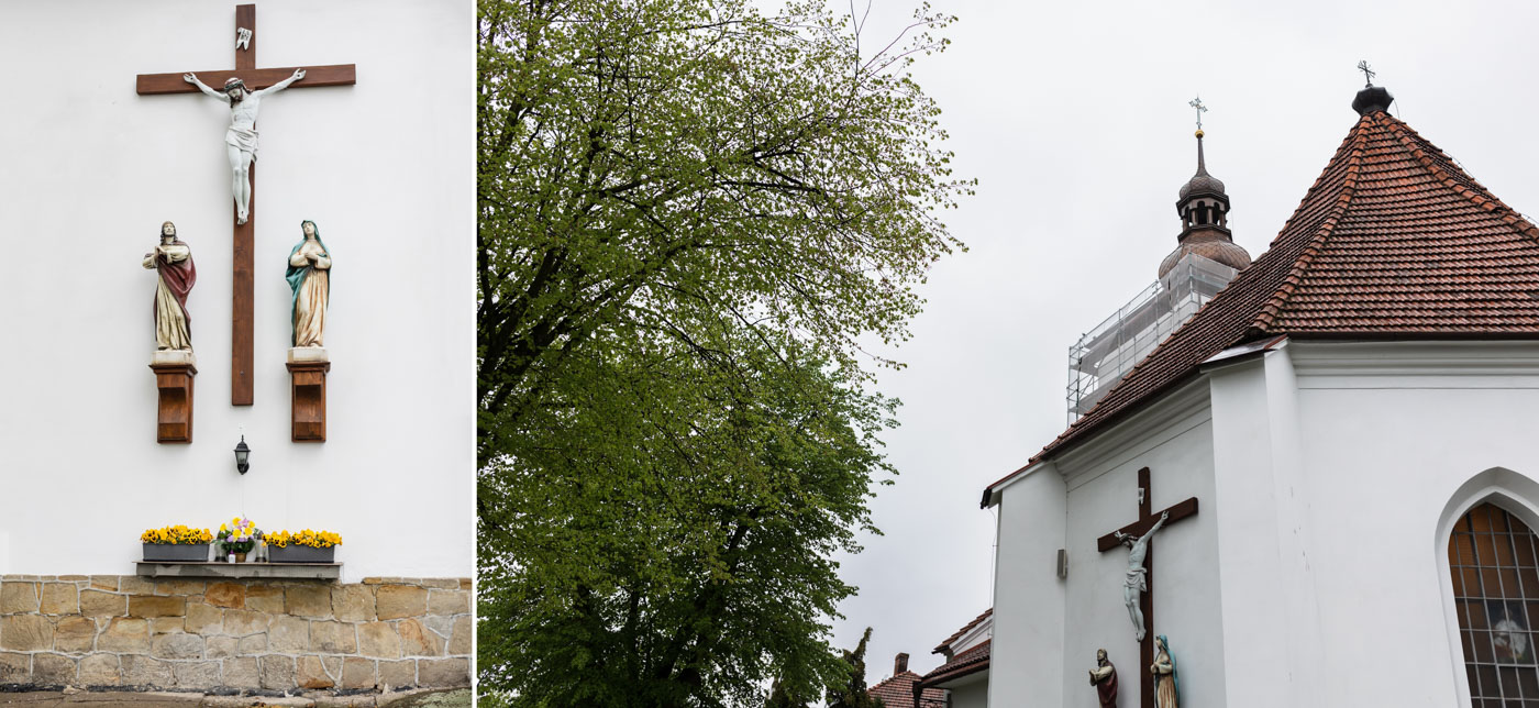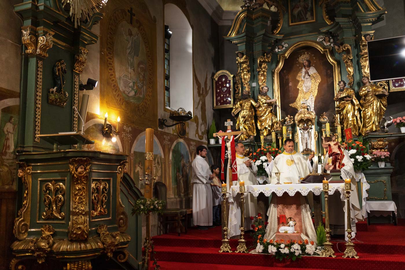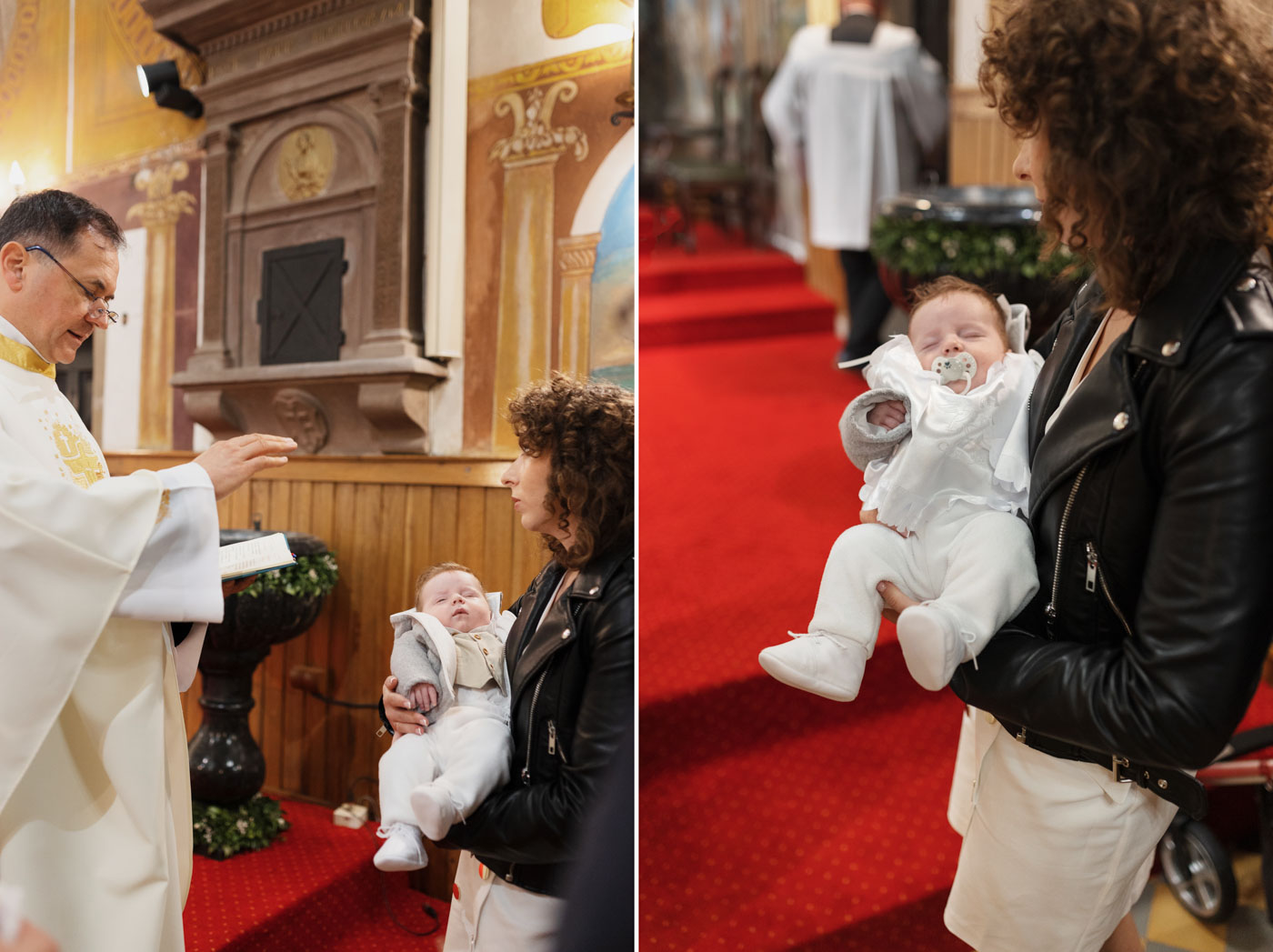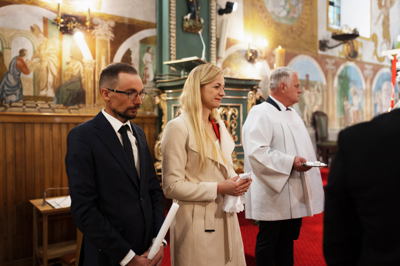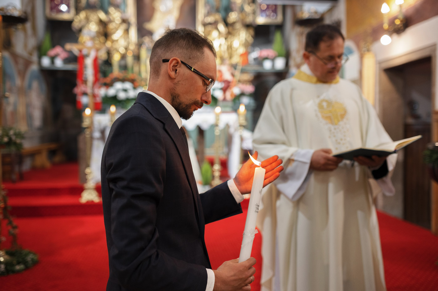 Ceremonia chrztu świętego odbyła się w kościele pw. Narodzenia NMP w Gdowie. Gabryś, drzemiąc w obliczu cudownego obrazu Matki Bożej Gdowskiej, ze spokojem przyjął sakrament chrztu. Nieco ciemne warunki w sanktuarium nie przeszkadzają mi w ujęciu tak ważnych momentów. Podniosła atmosfera oraz niewielki półmrok, rozświetlony nastrojowym, punktowym światłem nadały tym chwilom wyjątkowej aury. Po mszy świętej mieliśmy dla siebie chwilę na wykonanie pamiątkowego zdjęcia grupowego wraz z ujęciami z rodzicami chrzestnymi.