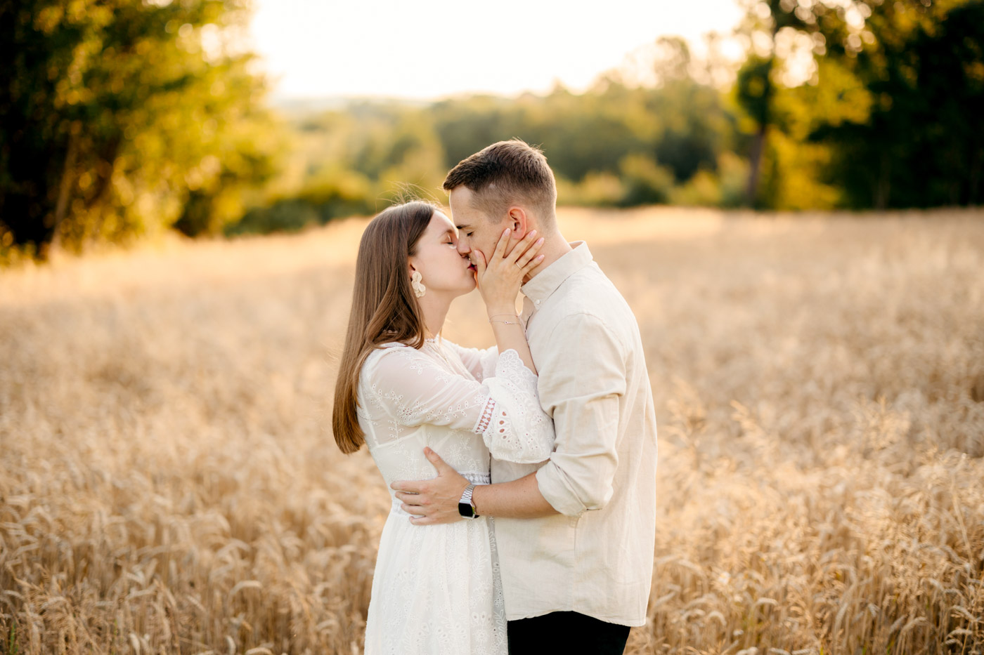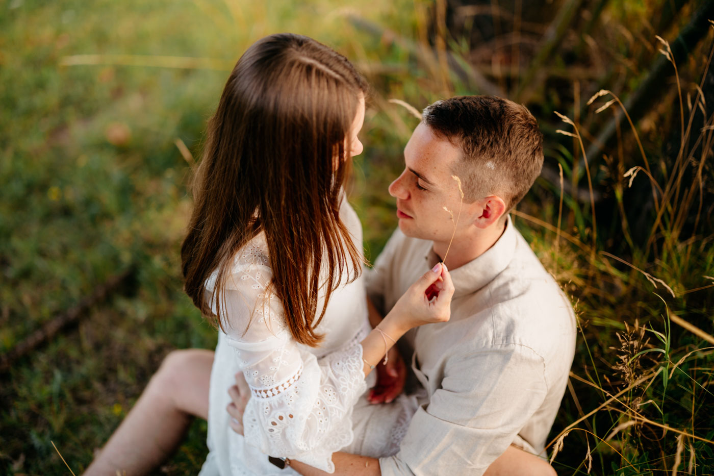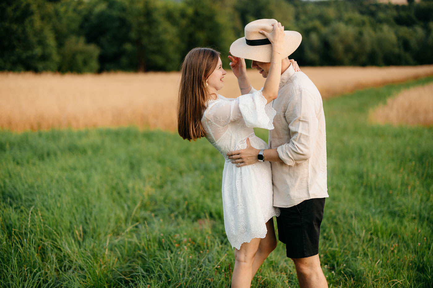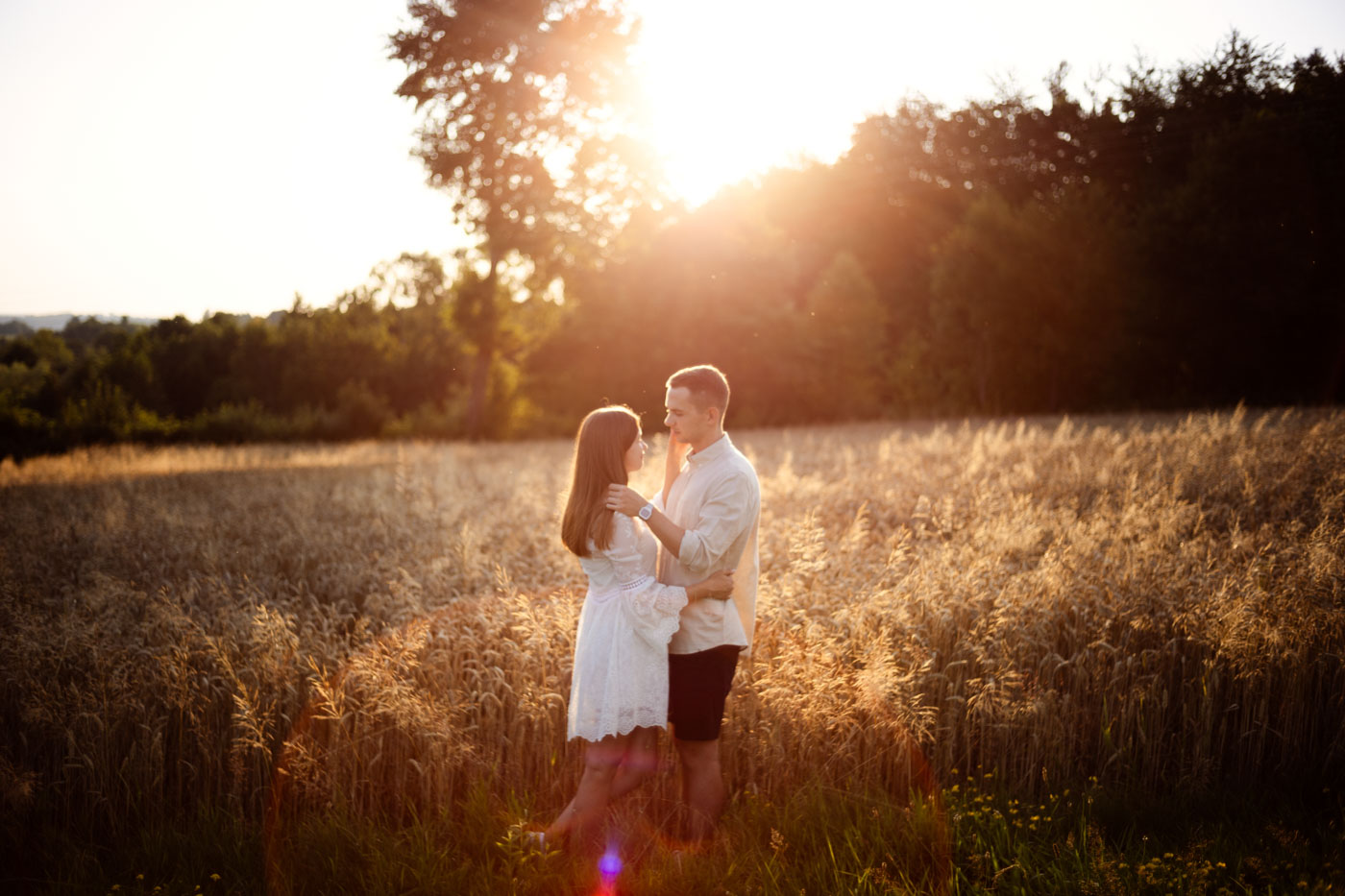 Ta sesja narzeczeńska w plenerze pod Krakowem była dokładnie taka, jak lubię najbardziej – swobodna, z dala od zgiełku miasta, w trawach. Wybraliśmy miejsce, gdzie asfalt zamienia się w polną drogę, a horyzont wypełniają złote łany zbóż i zielone łąki. Byliśmy tam zupełnie sami. Słońce powoli schodziło coraz niżej, a wiatr poruszał kłosami jak falami.
