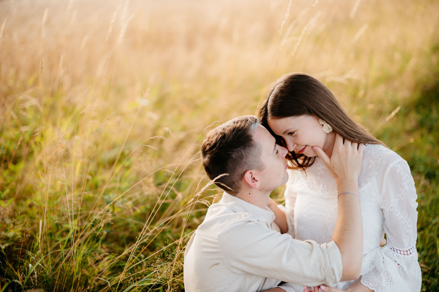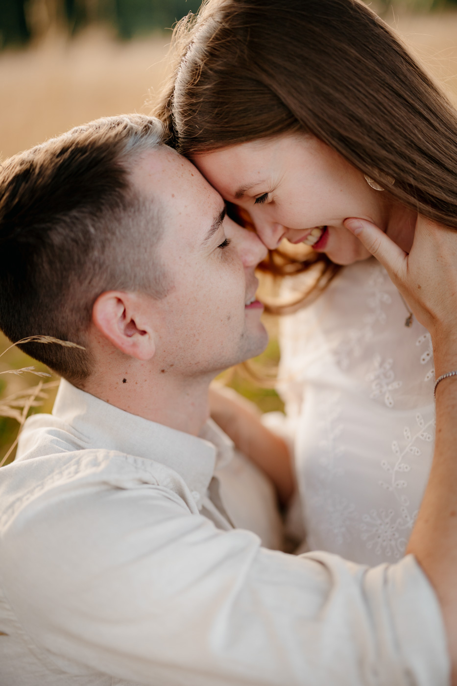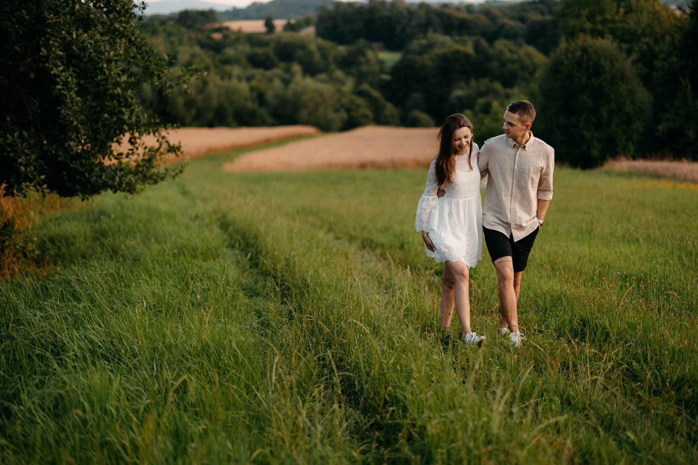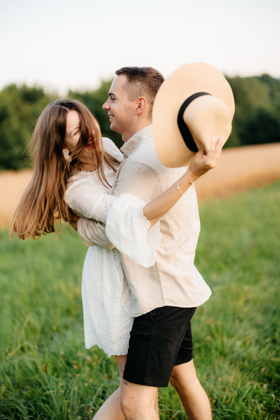 Ta sesja narzeczeńska w plenerze pod Krakowem była dokładnie taka, jak lubię najbardziej – swobodna, z dala od zgiełku miasta, w trawach. Wybraliśmy miejsce, gdzie asfalt zamienia się w polną drogę, a horyzont wypełniają złote łany zbóż i zielone łąki. Byliśmy tam zupełnie sami. Słońce powoli schodziło coraz niżej, a wiatr poruszał kłosami jak falami.