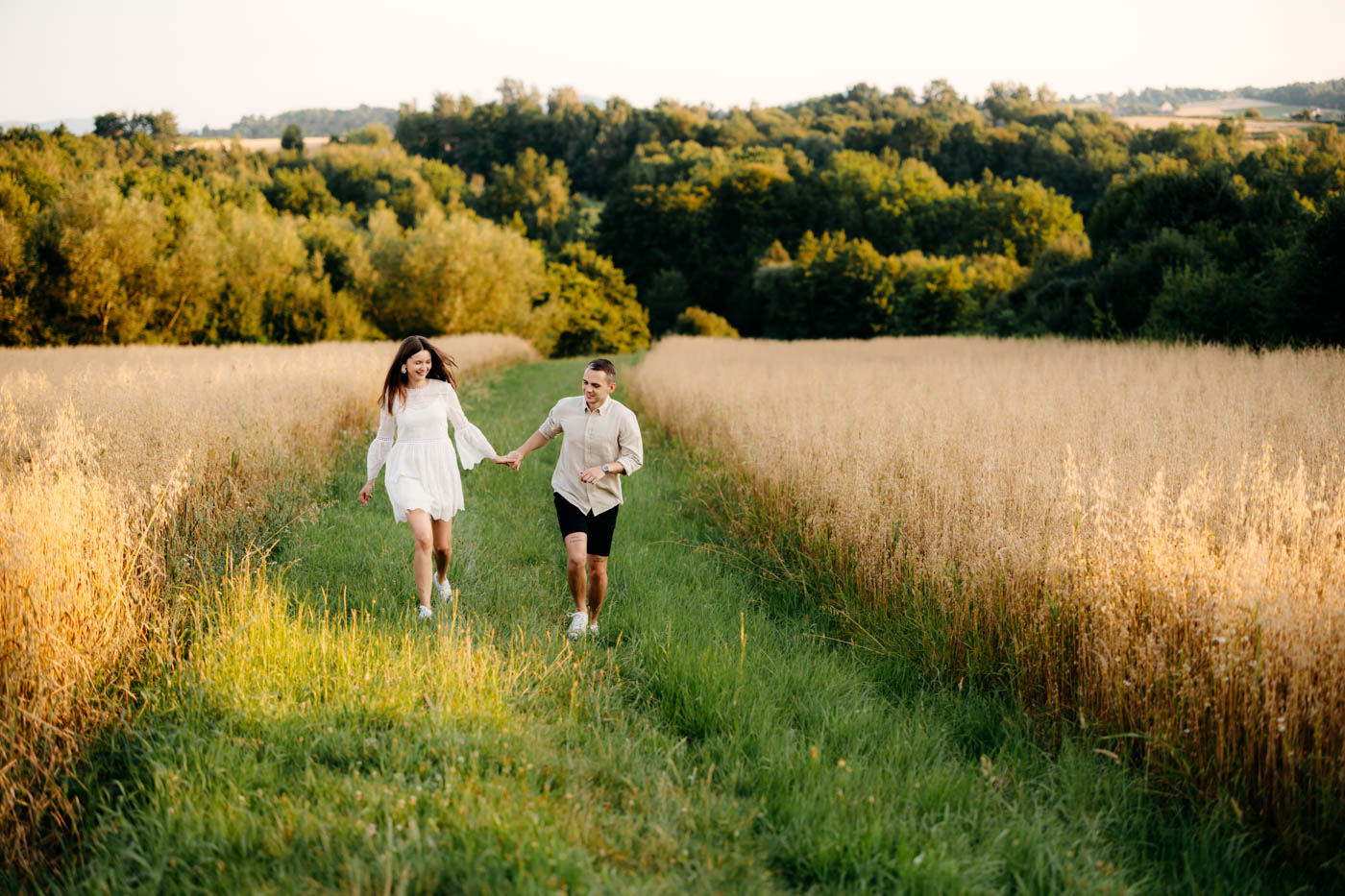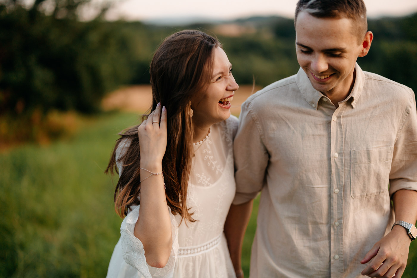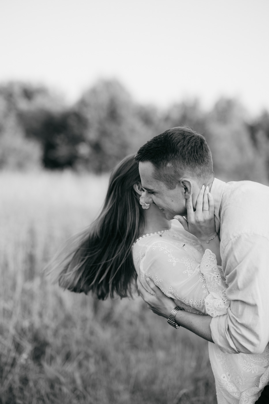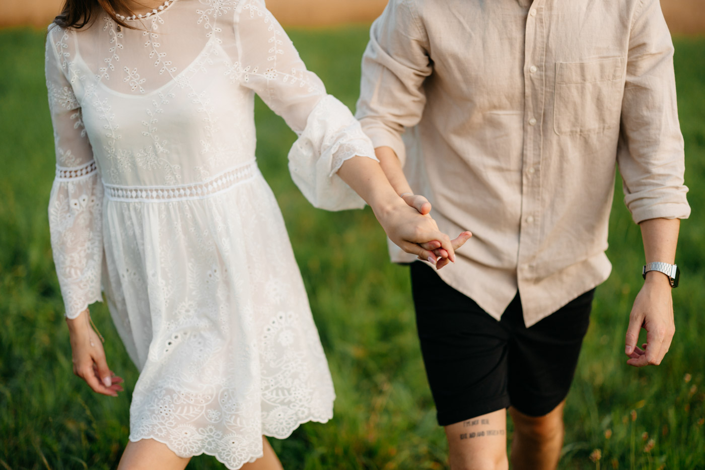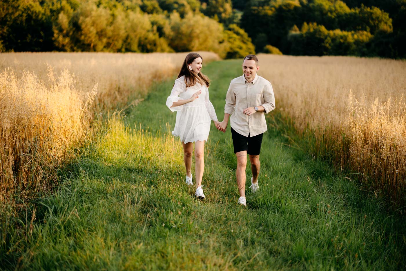 Ta sesja narzeczeńska w plenerze pod Krakowem była dokładnie taka, jak lubię najbardziej – swobodna, z dala od zgiełku miasta, w trawach. Wybraliśmy miejsce, gdzie asfalt zamienia się w polną drogę, a horyzont wypełniają złote łany zbóż i zielone łąki. Byliśmy tam zupełnie sami. Słońce powoli schodziło coraz niżej, a wiatr poruszał kłosami jak falami.