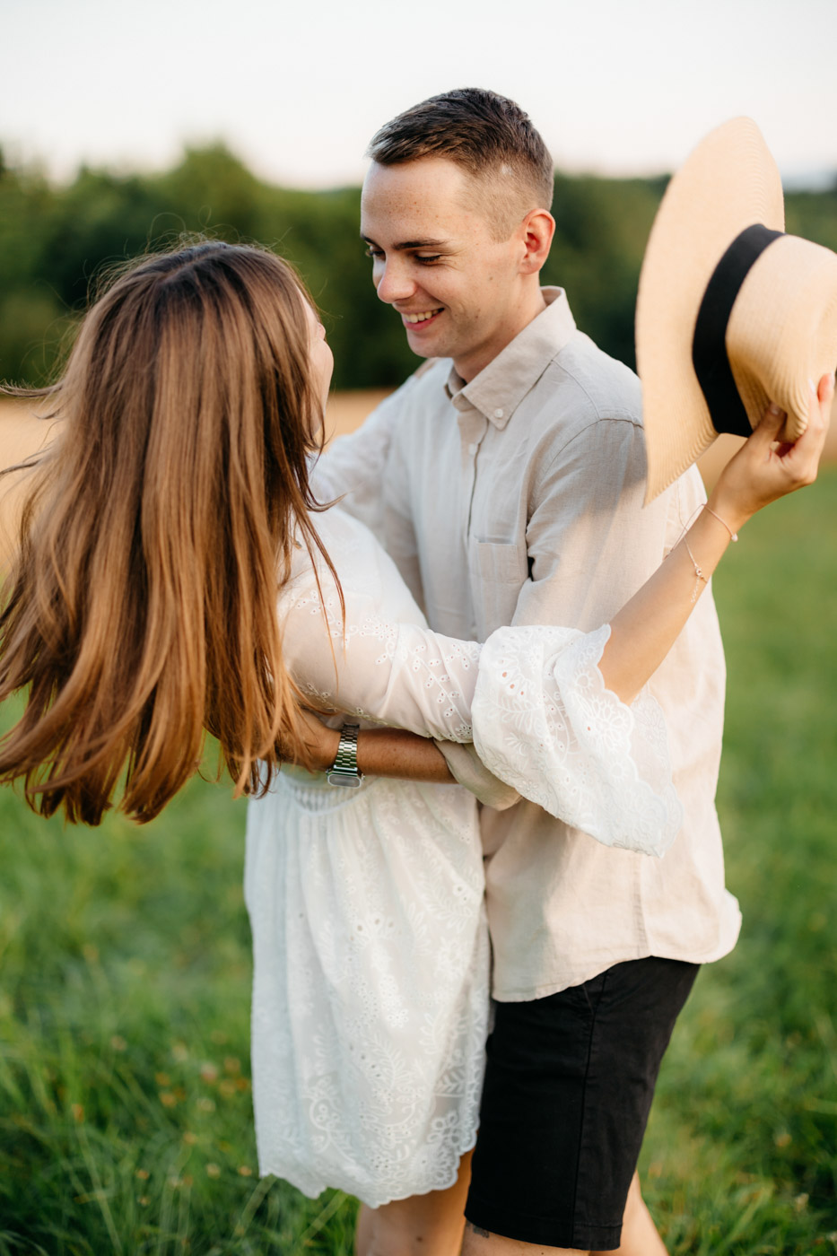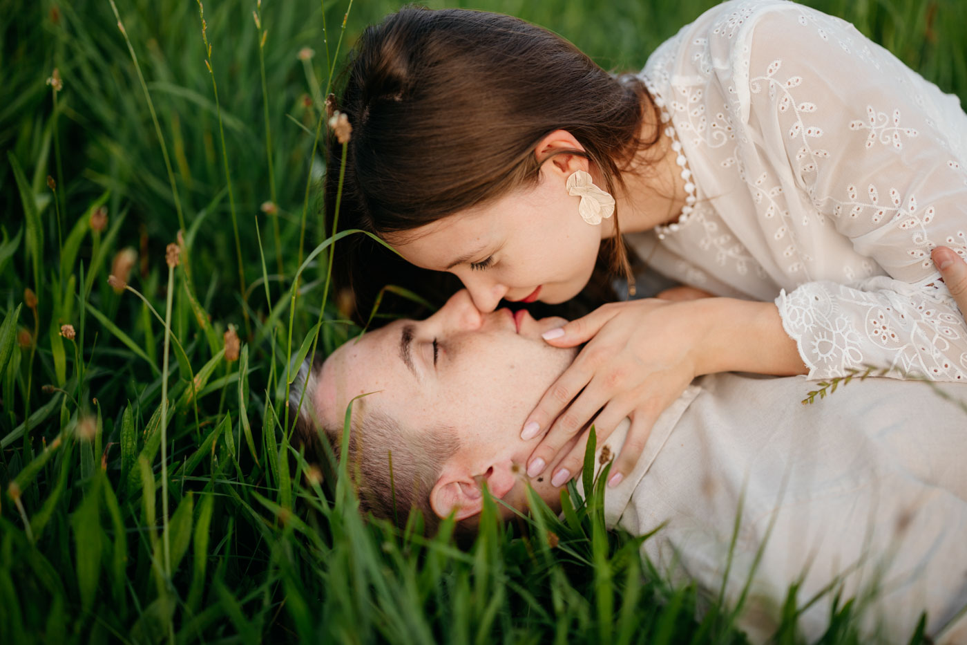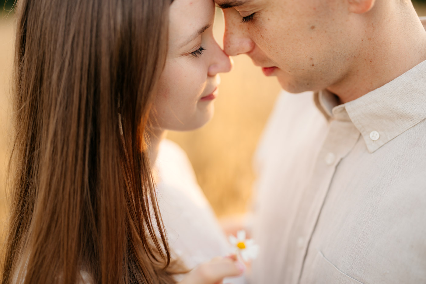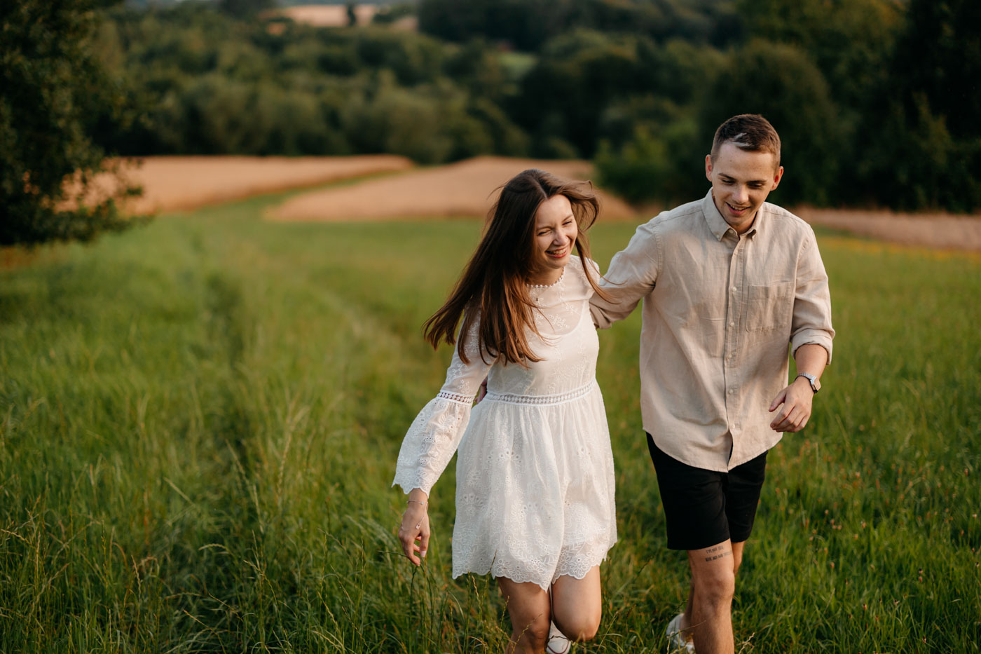 Ta sesja narzeczeńska w plenerze pod Krakowem była dokładnie taka, jak lubię najbardziej – swobodna, z dala od zgiełku miasta, w trawach. Wybraliśmy miejsce, gdzie asfalt zamienia się w polną drogę, a horyzont wypełniają złote łany zbóż i zielone łąki. Byliśmy tam zupełnie sami. Słońce powoli schodziło coraz niżej, a wiatr poruszał kłosami jak falami.