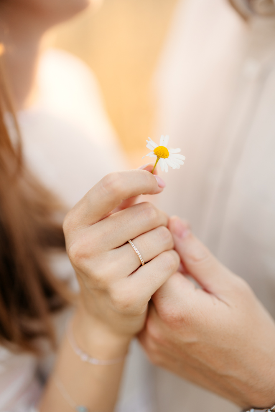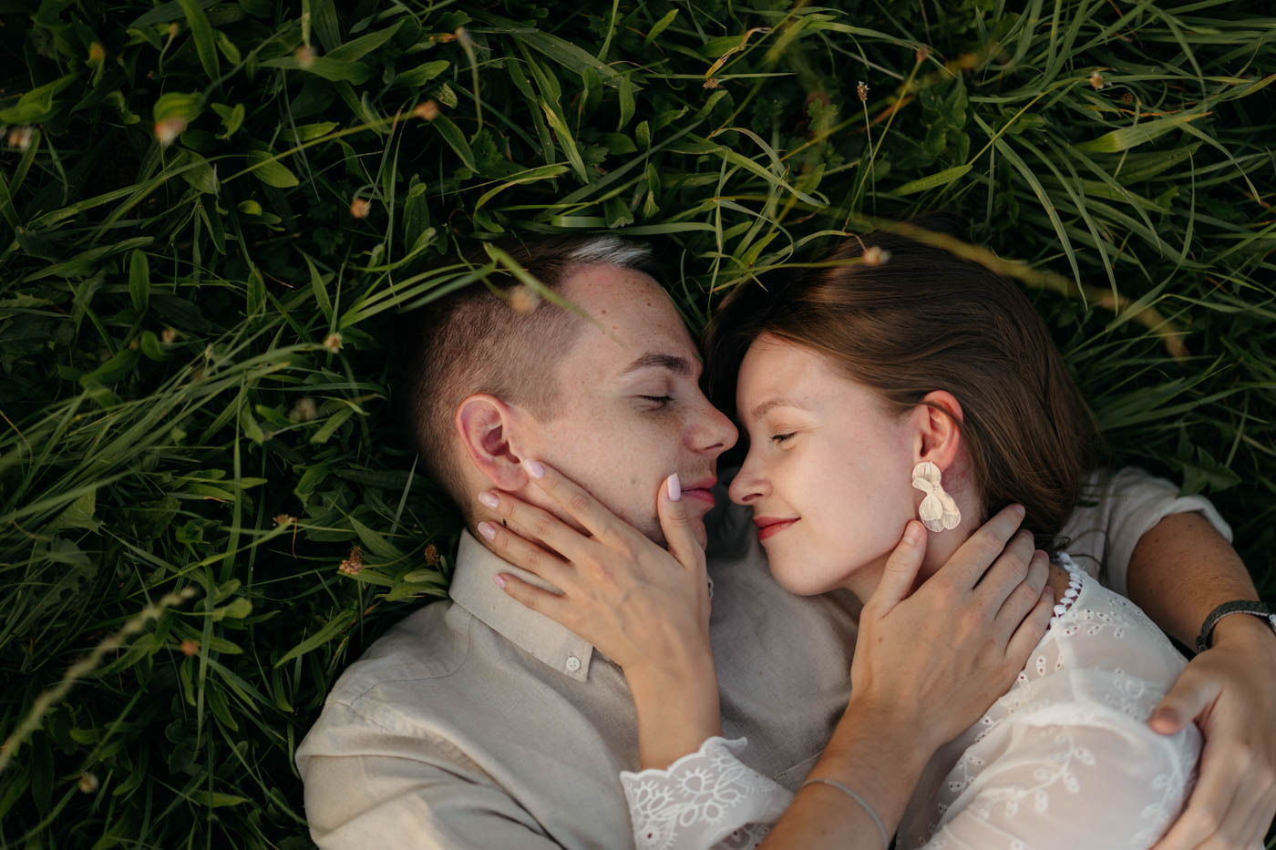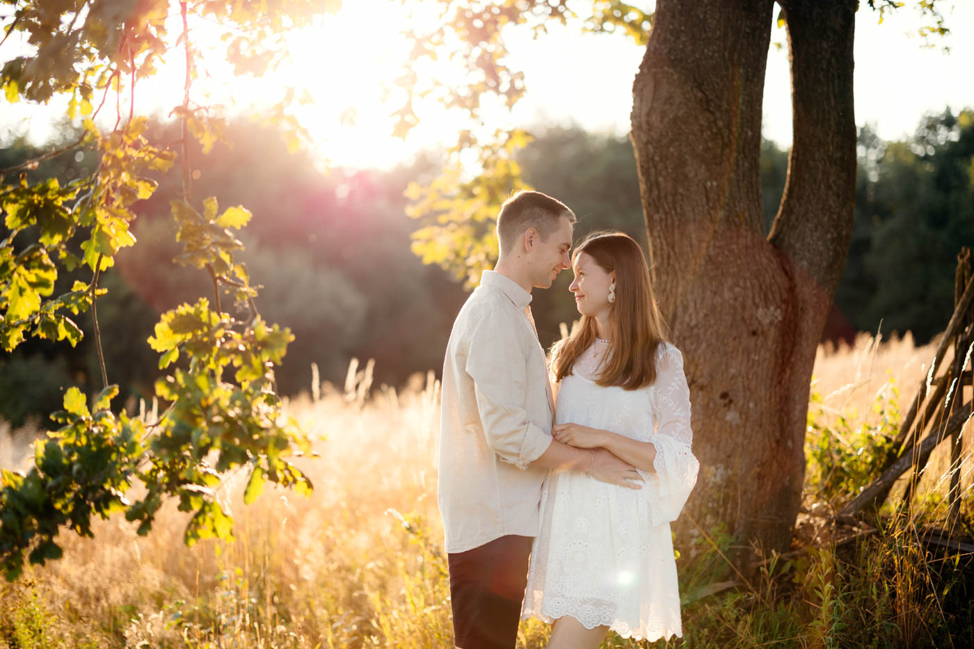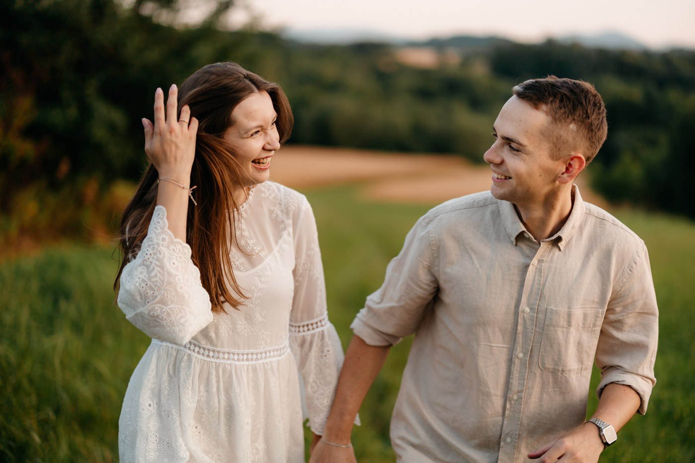 Ta sesja narzeczeńska w plenerze pod Krakowem była dokładnie taka, jak lubię najbardziej – swobodna, z dala od zgiełku miasta, w trawach. Wybraliśmy miejsce, gdzie asfalt zamienia się w polną drogę, a horyzont wypełniają złote łany zbóż i zielone łąki. Byliśmy tam zupełnie sami. Słońce powoli schodziło coraz niżej, a wiatr poruszał kłosami jak falami.