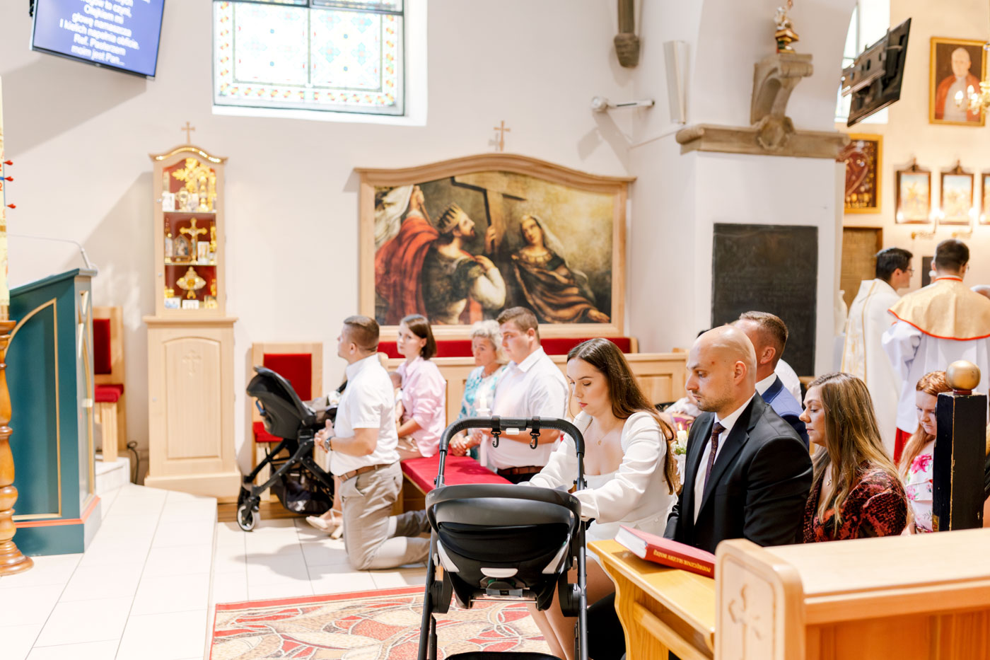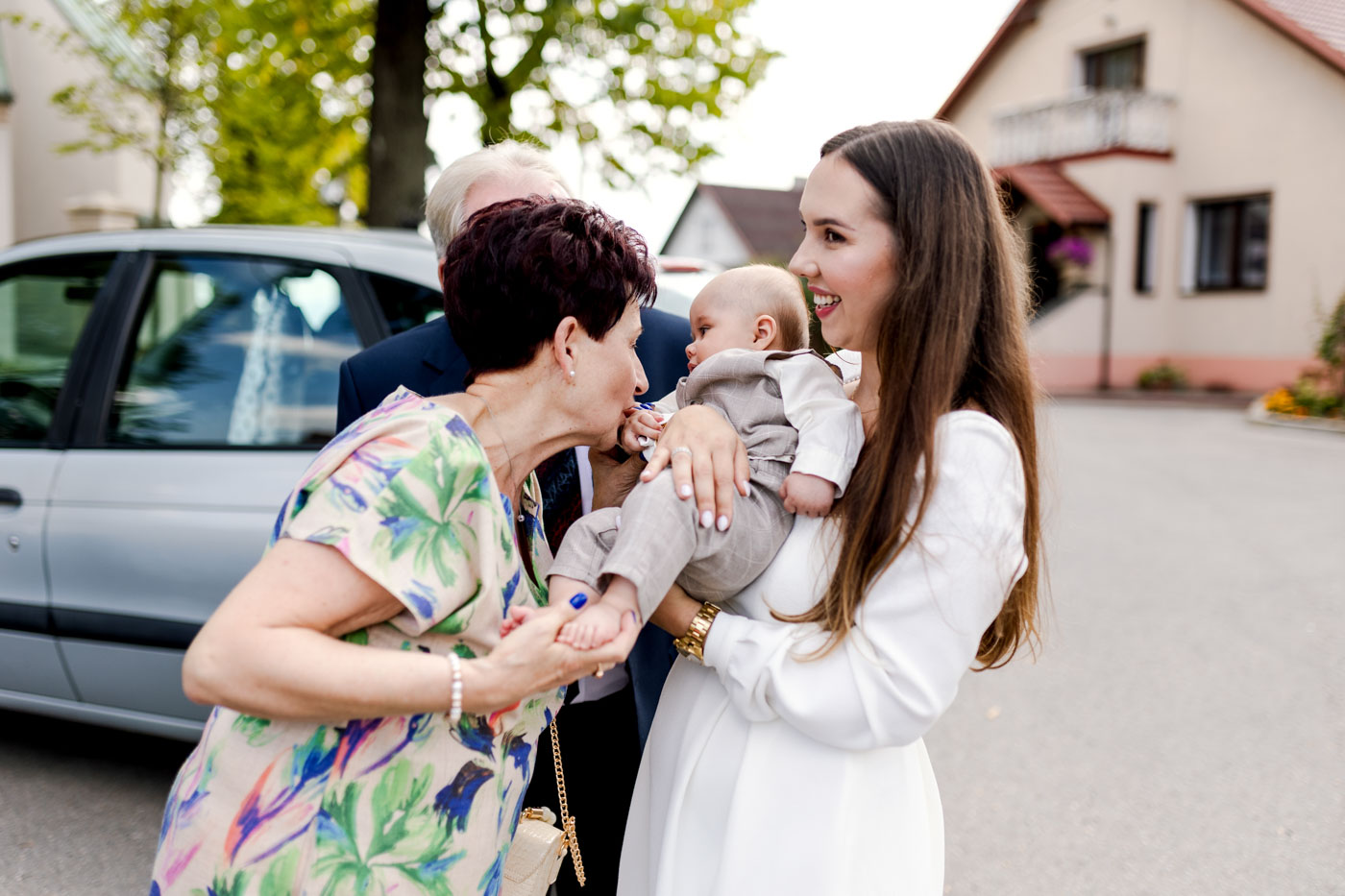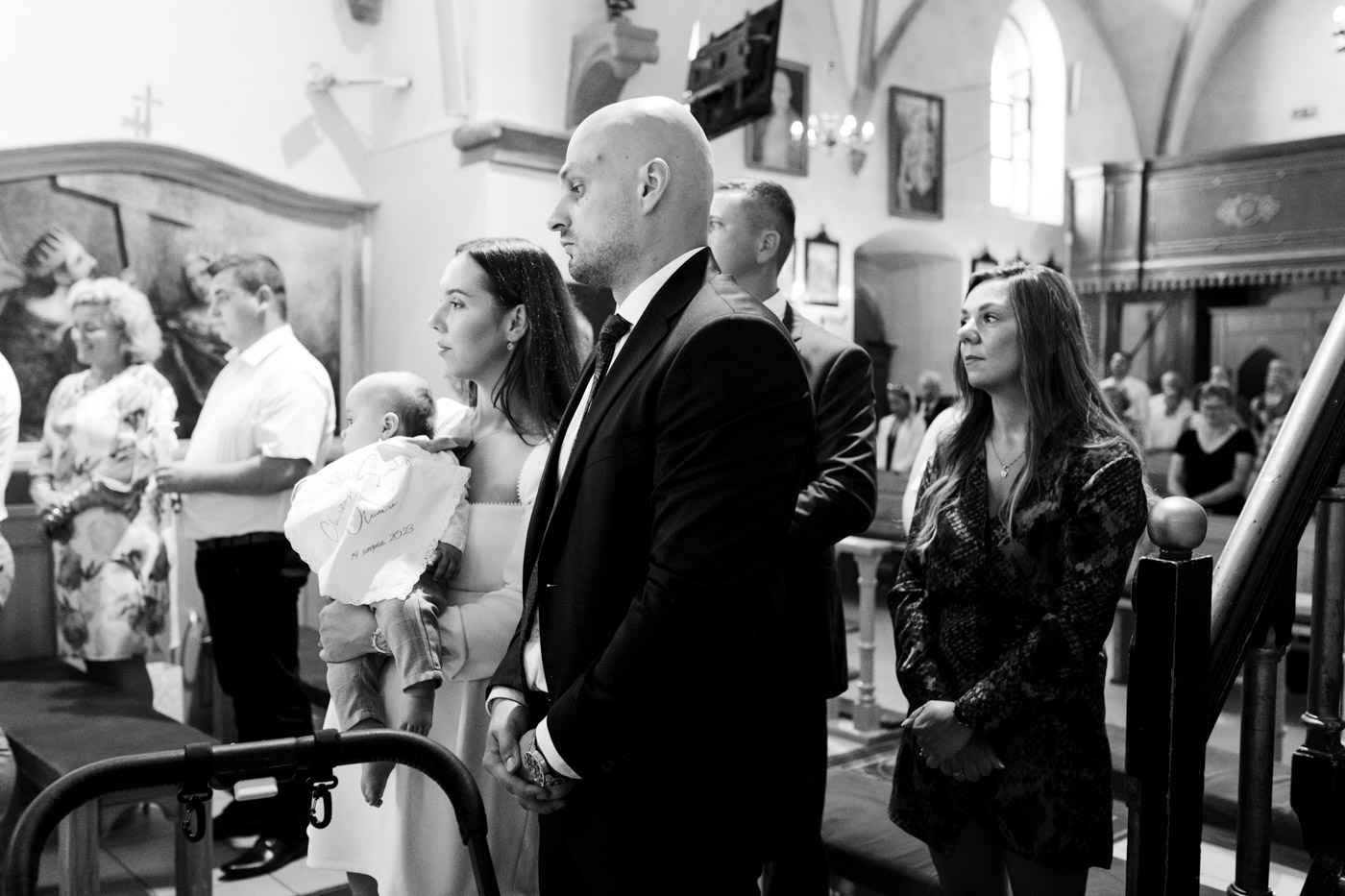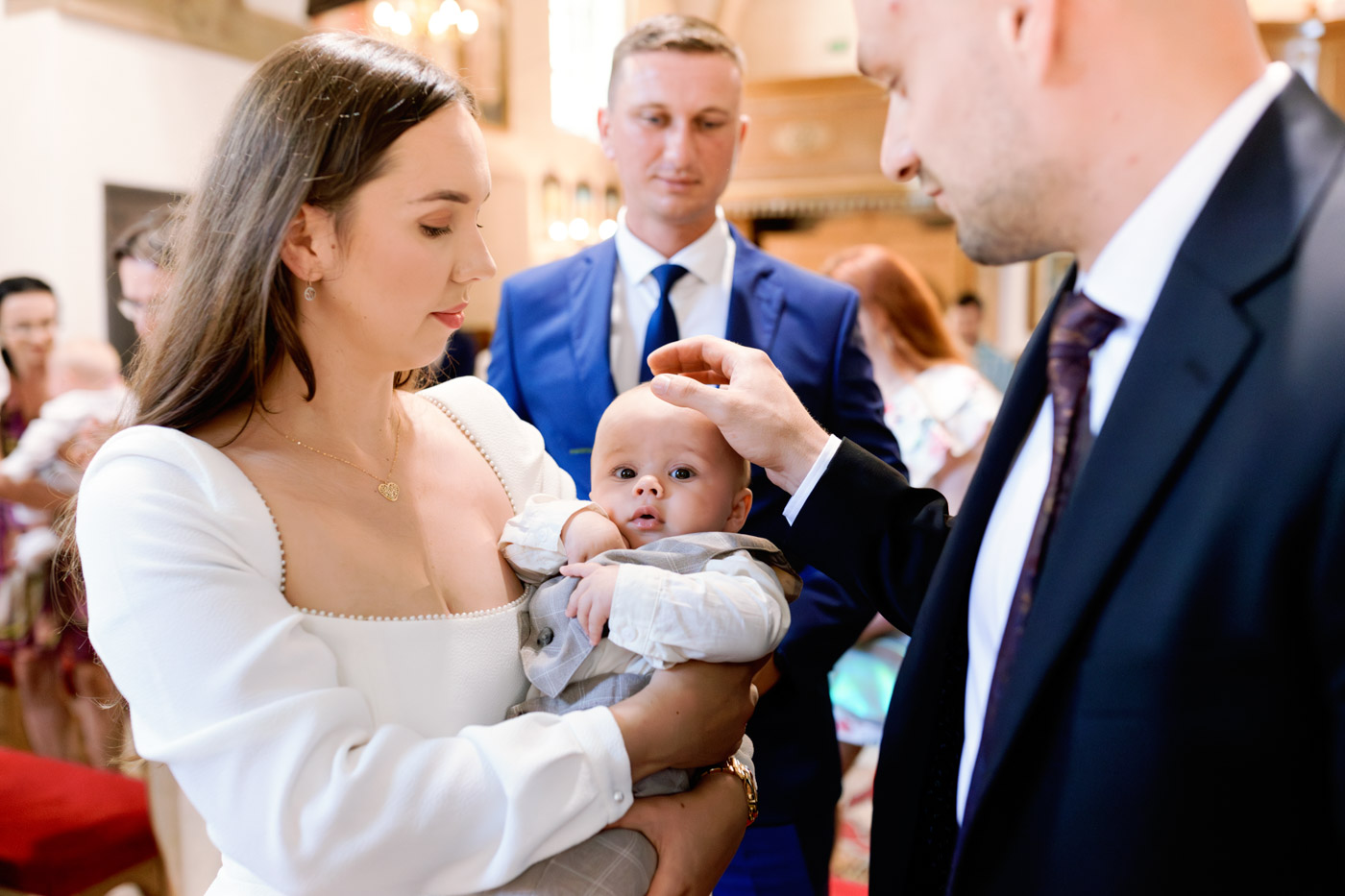 Uroczystość przyjęcia sakramentu odbyła się niewielkim kościele nieopodal Wieliczki. W trakcie mszy malutki Oliwier bacznie obserwował otoczenie i w żadnym momencie nie uronił ani jednej łzy. Maluch ze spokojem przyjął sakrament chrztu. Dzięki temu, że mogłam sobie pozwolić na bycie tuż obok rodziców, miałam okazję stworzyć idealne ujęcia momentu polewania główki. Niestety warunki w kościołach bywają różne. Nie zawsze fotograf ma miejsce lub możliwość, aby podejść na tyle blisko, aby mieć bezpośredni widok na kluczowe momenty w trakcie mszy. Dlatego tak ważnym jest to, żeby rodzice powoli i bez pośpiechu wykonywali poszczególne gesty. Warto czasami spojrzeć, czy fotograf nie został przez kogoś zasłoniony, czy nie stoimy do niego całkowicie tyłem, aby finalnie otrzymać wyjątkowe zdjęcia z chrzcin.