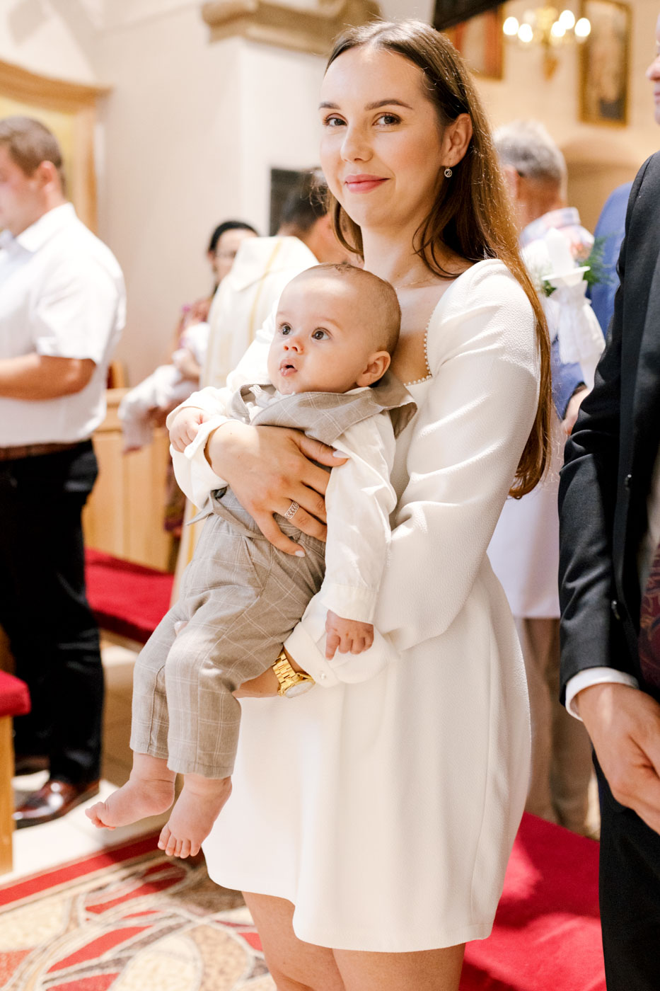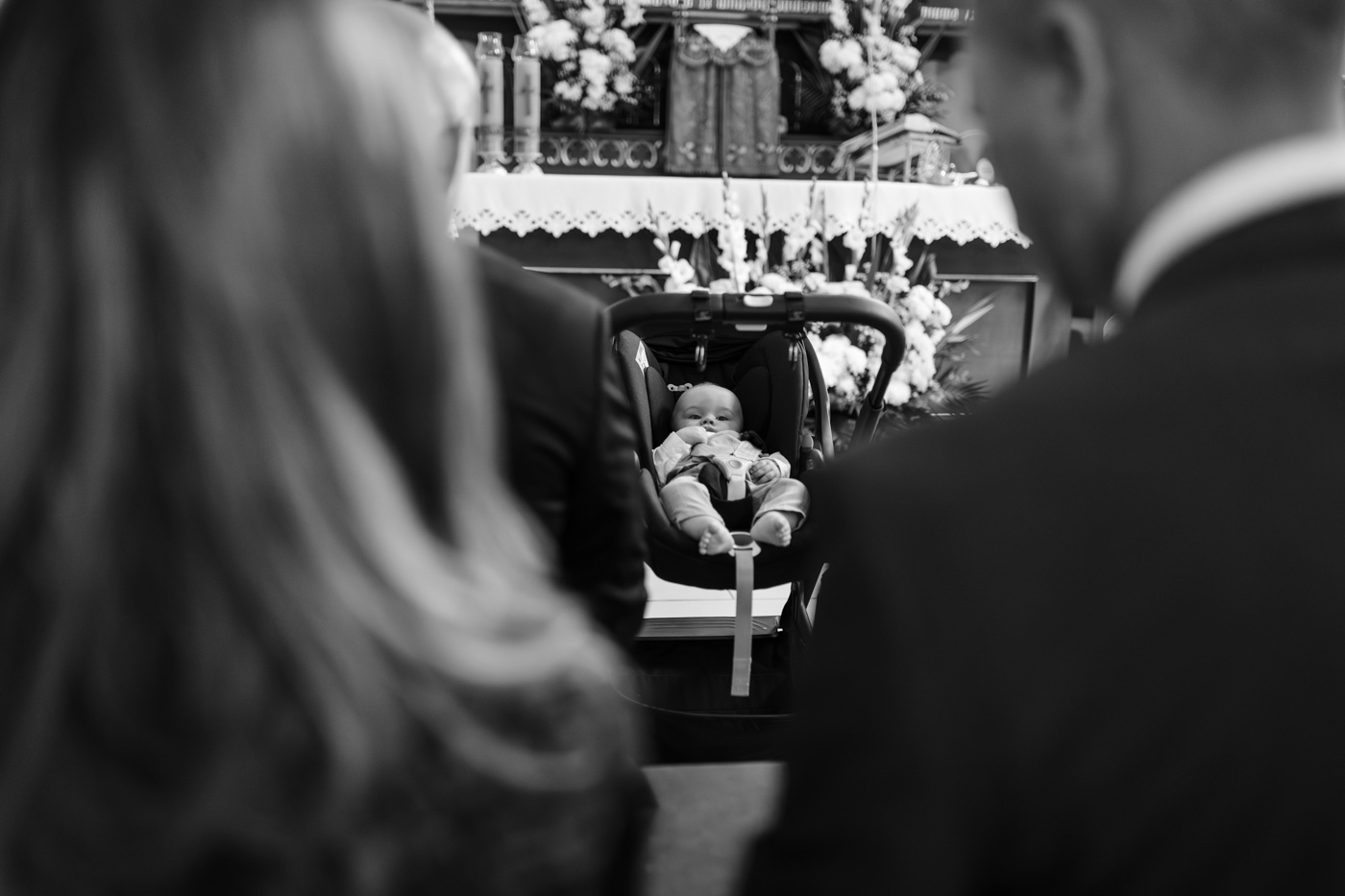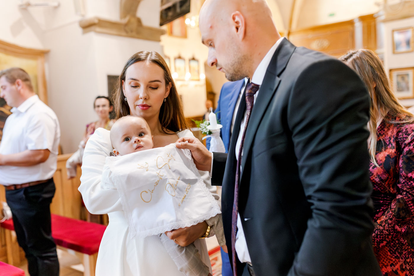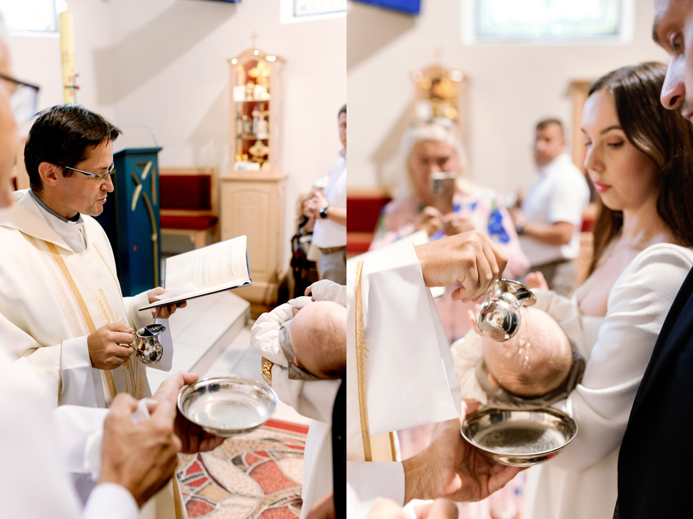 Uroczystość przyjęcia sakramentu odbyła się niewielkim kościele nieopodal Wieliczki. W trakcie mszy malutki Oliwier bacznie obserwował otoczenie i w żadnym momencie nie uronił ani jednej łzy. Maluch ze spokojem przyjął sakrament chrztu. Dzięki temu, że mogłam sobie pozwolić na bycie tuż obok rodziców, miałam okazję stworzyć idealne ujęcia momentu polewania główki. Niestety warunki w kościołach bywają różne. Nie zawsze fotograf ma miejsce lub możliwość, aby podejść na tyle blisko, aby mieć bezpośredni widok na kluczowe momenty w trakcie mszy. Dlatego tak ważnym jest to, żeby rodzice powoli i bez pośpiechu wykonywali poszczególne gesty. Warto czasami spojrzeć, czy fotograf nie został przez kogoś zasłoniony, czy nie stoimy do niego całkowicie tyłem, aby finalnie otrzymać wyjątkowe zdjęcia z chrzcin.
