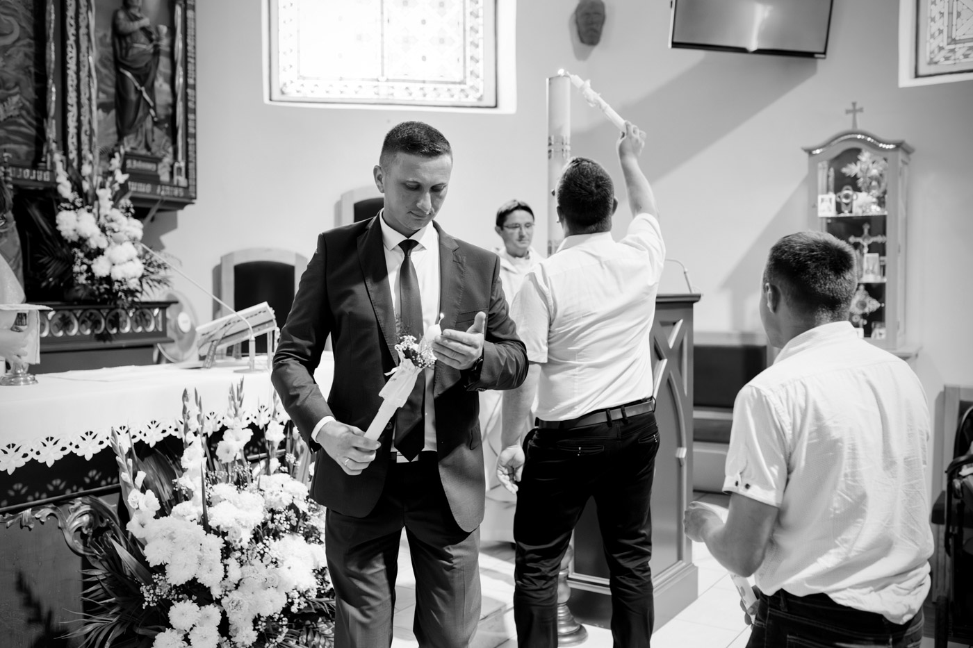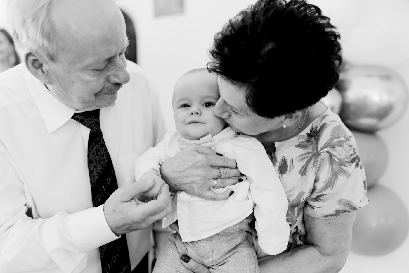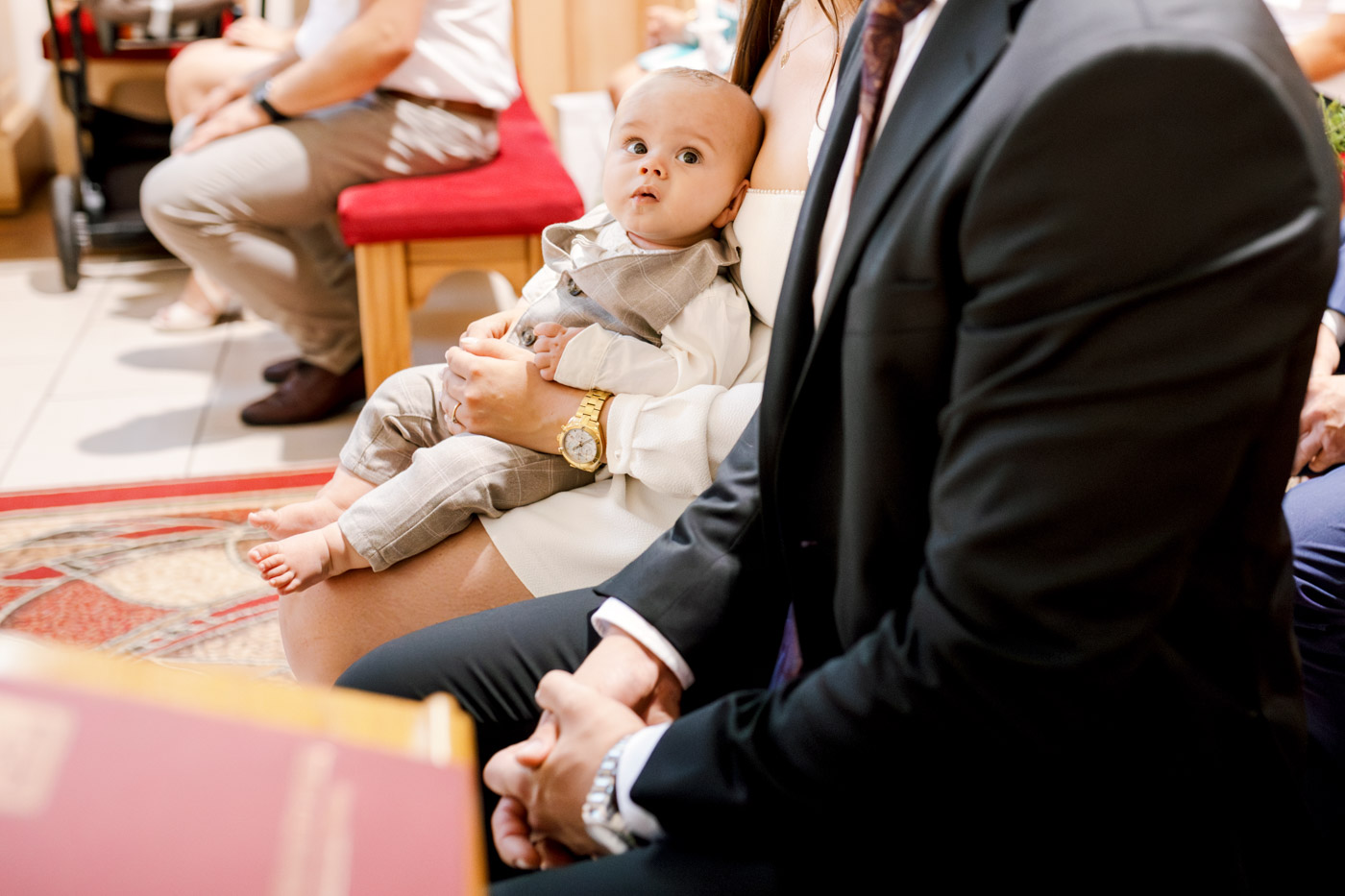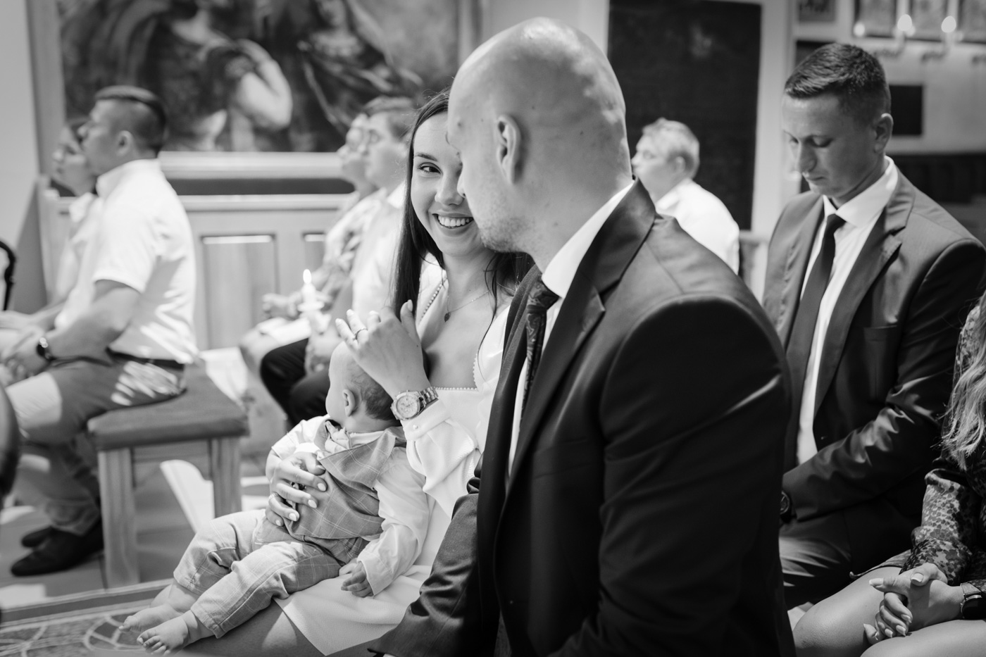 Uroczystość przyjęcia sakramentu odbyła się niewielkim kościele nieopodal Wieliczki. W trakcie mszy malutki Oliwier bacznie obserwował otoczenie i w żadnym momencie nie uronił ani jednej łzy. Maluch ze spokojem przyjął sakrament chrztu. Dzięki temu, że mogłam sobie pozwolić na bycie tuż obok rodziców, miałam okazję stworzyć idealne ujęcia momentu polewania główki. Niestety warunki w kościołach bywają różne. Nie zawsze fotograf ma miejsce lub możliwość, aby podejść na tyle blisko, aby mieć bezpośredni widok na kluczowe momenty w trakcie mszy. Dlatego tak ważnym jest to, żeby rodzice powoli i bez pośpiechu wykonywali poszczególne gesty. Warto czasami spojrzeć, czy fotograf nie został przez kogoś zasłoniony, czy nie stoimy do niego całkowicie tyłem, aby finalnie otrzymać wyjątkowe zdjęcia z chrzcin.