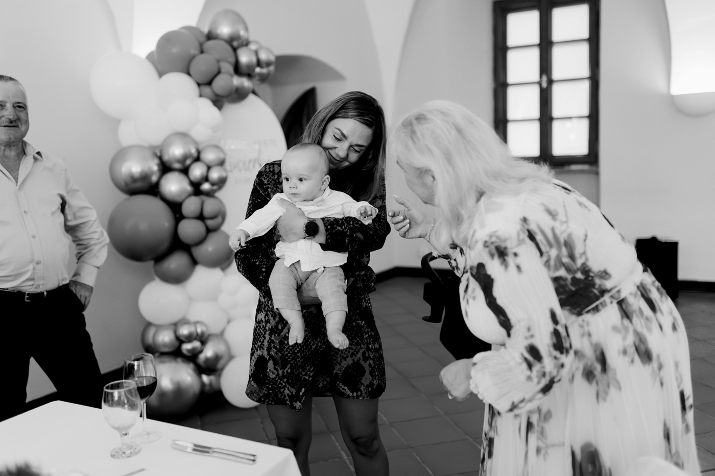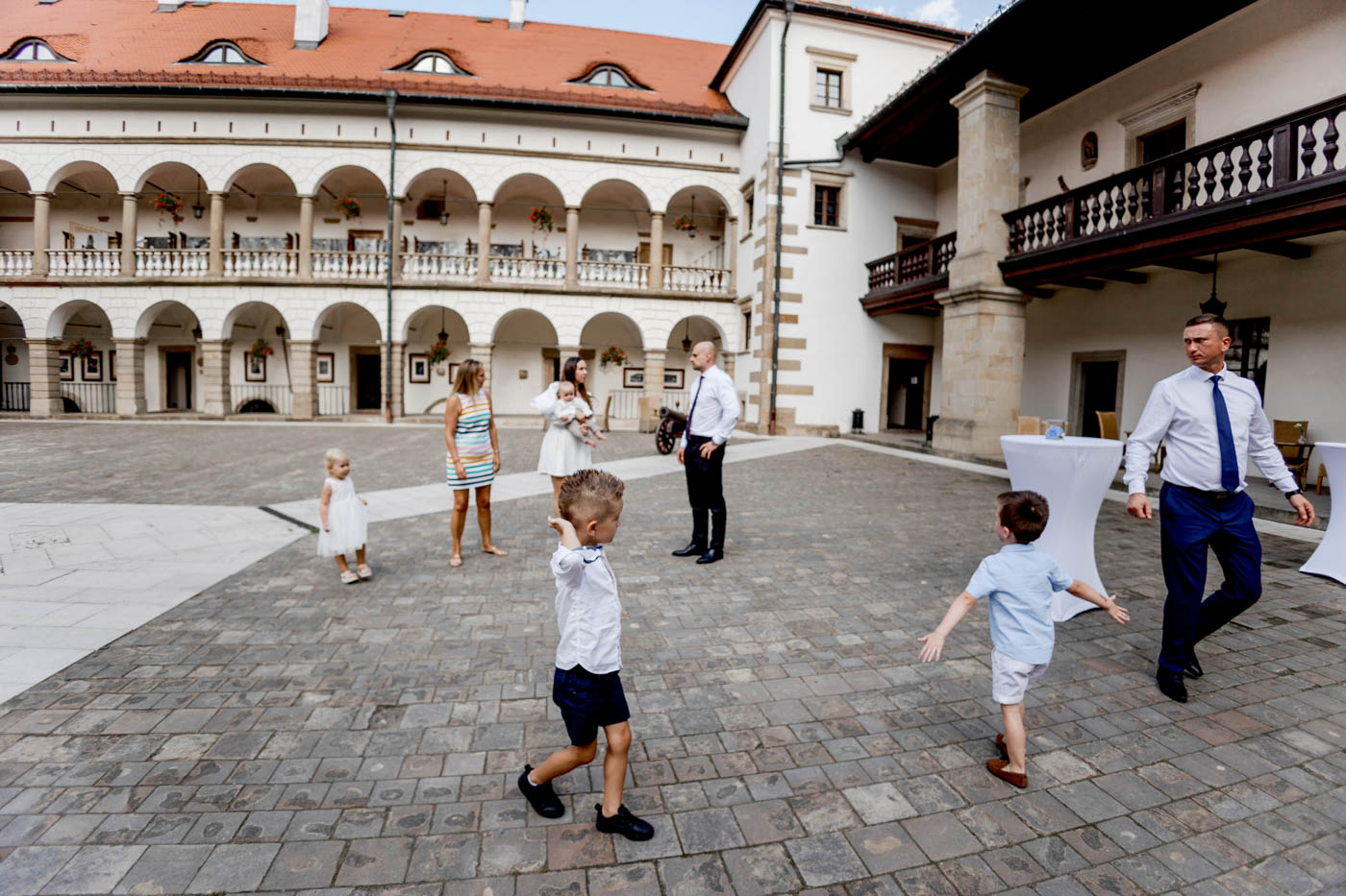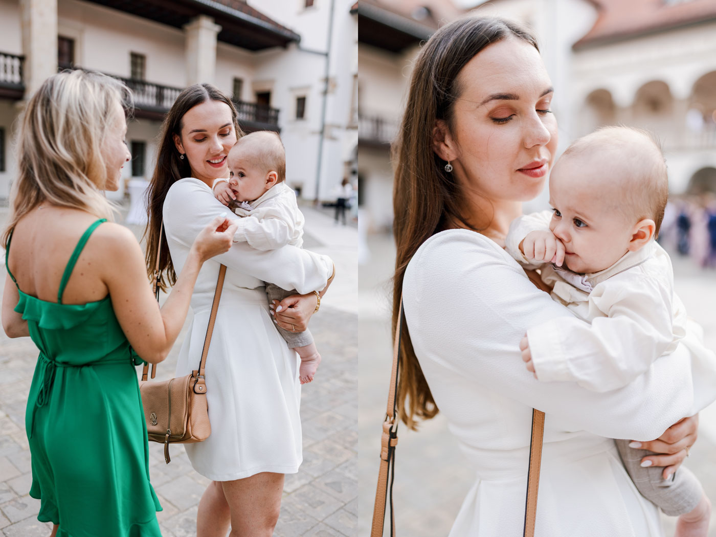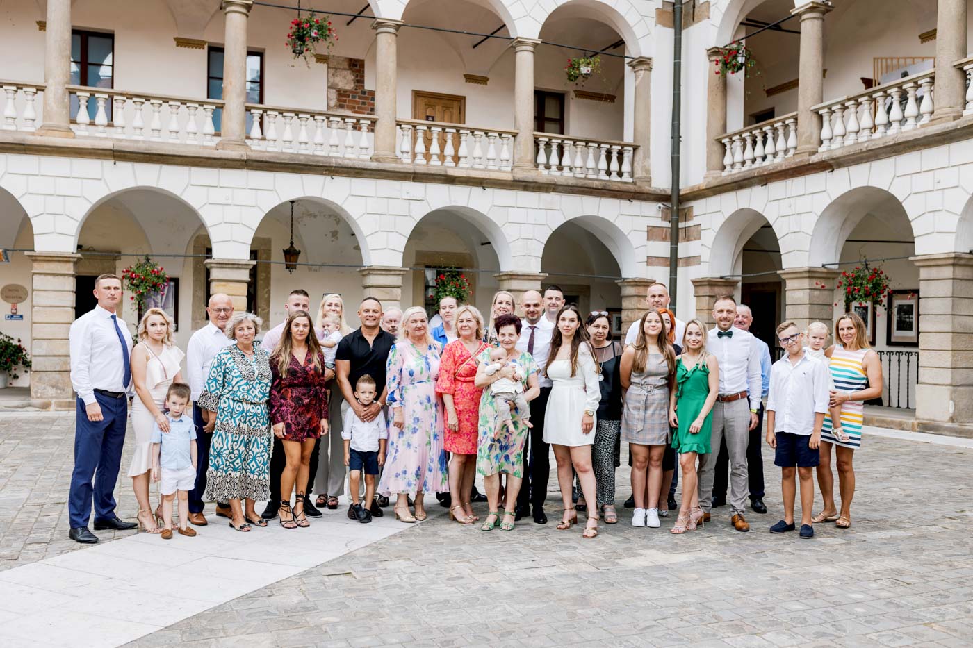 Uroczysty obiad został zorganizowany w niezwykle unikatowym i wyjątkowym miejscu. Zamek w Niepołomicach często nazywany “drugim Wawelem” to perła renesansowej architektury, niegdysiejszy dom dynastii Piastów i Jagiellonów. Muszę przyznać, że zarówno obiad, jak i mury zamku wywarły na mnie ogromne wrażenie. Cieszę się, że mogłam stworzyć relację z rodzinnej uroczystości w tak niecodziennych okolicznościach. Pamiątkowe zdjęcia rodzinne i ujęcie grupowe na obszernym dziedzińcu były zwieńczeniem reportażu. To jeden z moich ulubionych momentów, gdy wszyscy są już rozluźnieni. W tym momencie bez pośpiechu możemy sfotografować zarówno samych rodziców z maluchem, jak i wszystkich gości. To czas na stworzenie portretów i ujęć, które zostaną bezcenną pamiątką dla Was i Waszego maluszka.
