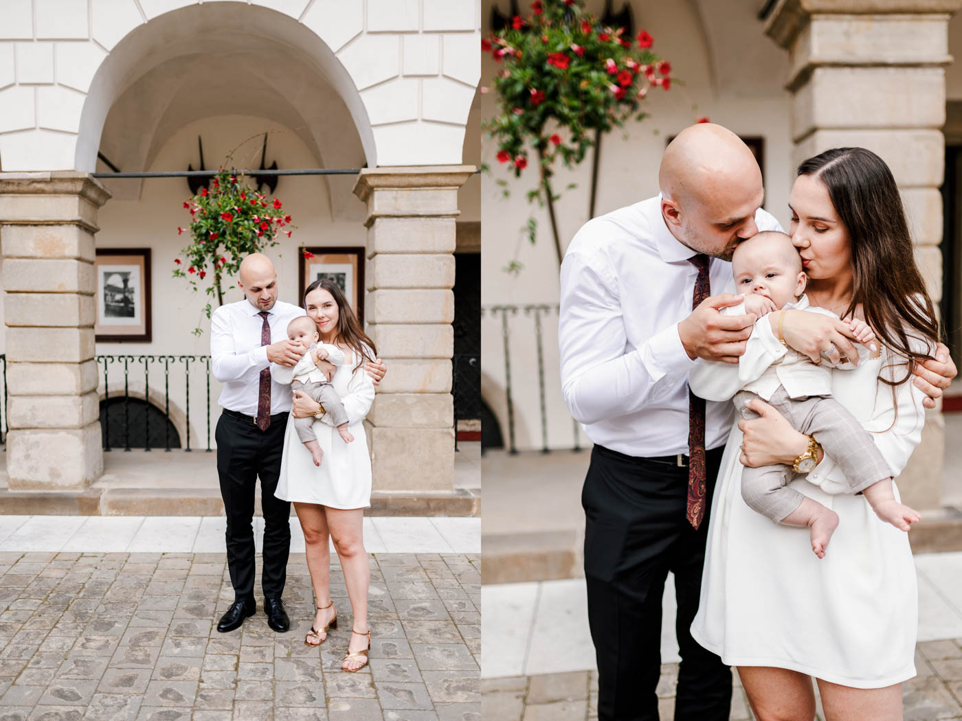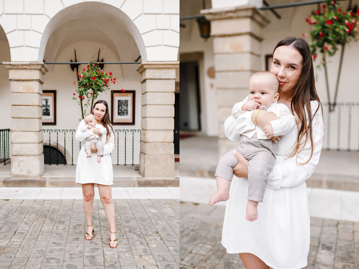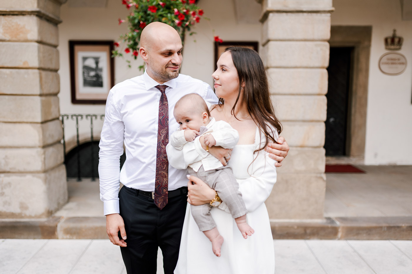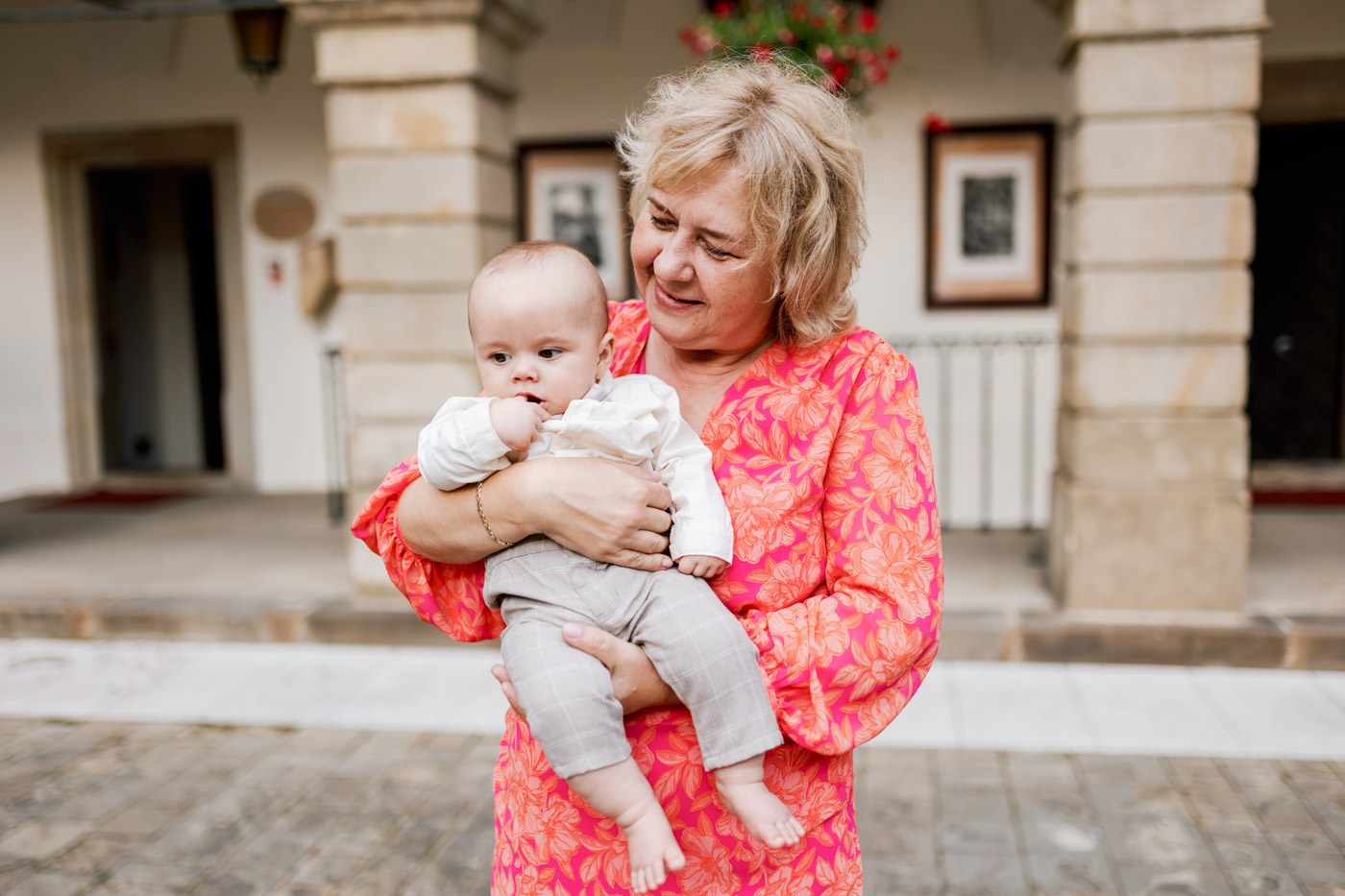 Uroczysty obiad został zorganizowany w niezwykle unikatowym i wyjątkowym miejscu. Zamek w Niepołomicach często nazywany “drugim Wawelem” to perła renesansowej architektury, niegdysiejszy dom dynastii Piastów i Jagiellonów. Muszę przyznać, że zarówno obiad, jak i mury zamku wywarły na mnie ogromne wrażenie. Cieszę się, że mogłam stworzyć relację z rodzinnej uroczystości w tak niecodziennych okolicznościach. Pamiątkowe zdjęcia rodzinne i ujęcie grupowe na obszernym dziedzińcu były zwieńczeniem reportażu. To jeden z moich ulubionych momentów, gdy wszyscy są już rozluźnieni. W tym momencie bez pośpiechu możemy sfotografować zarówno samych rodziców z maluchem, jak i wszystkich gości. To czas na stworzenie portretów i ujęć, które zostaną bezcenną pamiątką dla Was i Waszego maluszka.