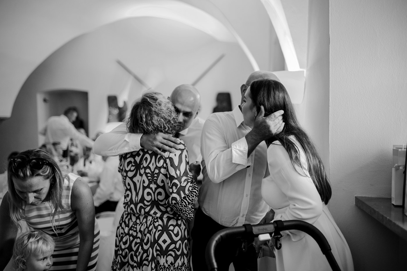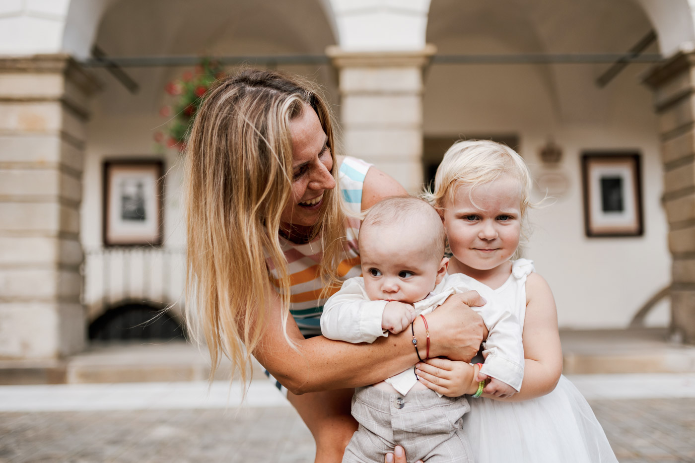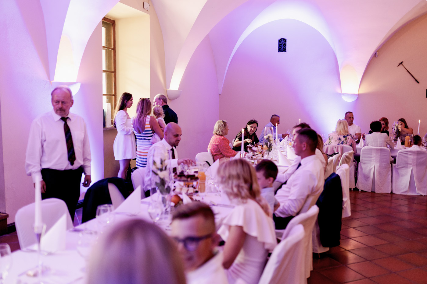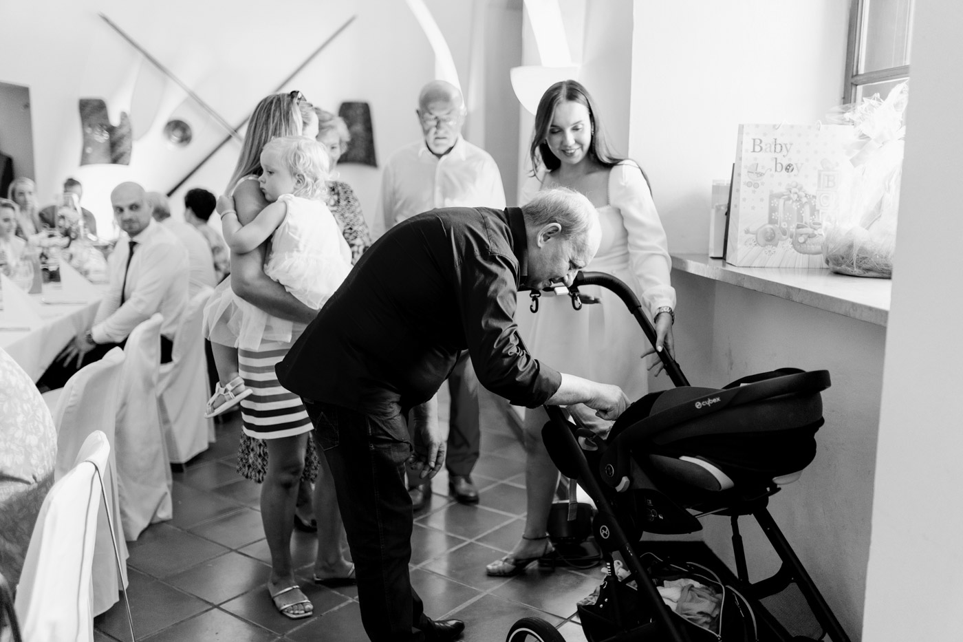 Uroczysty obiad został zorganizowany w niezwykle unikatowym i wyjątkowym miejscu. Zamek w Niepołomicach często nazywany “drugim Wawelem” to perła renesansowej architektury, niegdysiejszy dom dynastii Piastów i Jagiellonów. Muszę przyznać, że zarówno obiad, jak i mury zamku wywarły na mnie ogromne wrażenie. Cieszę się, że mogłam stworzyć relację z rodzinnej uroczystości w tak niecodziennych okolicznościach. Pamiątkowe zdjęcia rodzinne i ujęcie grupowe na obszernym dziedzińcu były zwieńczeniem reportażu. To jeden z moich ulubionych momentów, gdy wszyscy są już rozluźnieni. W tym momencie bez pośpiechu możemy sfotografować zarówno samych rodziców z maluchem, jak i wszystkich gości. To czas na stworzenie portretów i ujęć, które zostaną bezcenną pamiątką dla Was i Waszego maluszka.